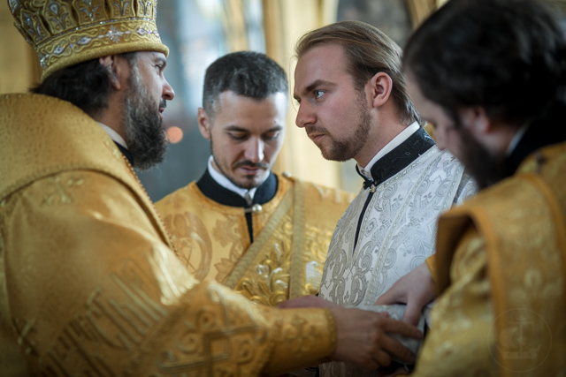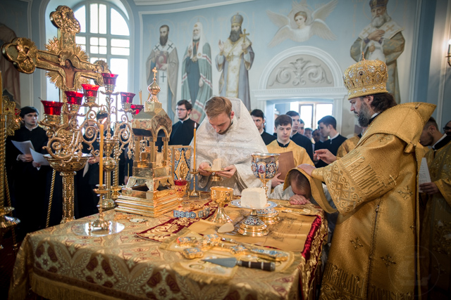 За богослужением архиепископ Амвросий совершил две хиротонии: студента 1 курса магистратуры диакона Антония Копаева в священника и студента 3 курса бакалавриата иподиакона Константина Суржикова - в диакона.