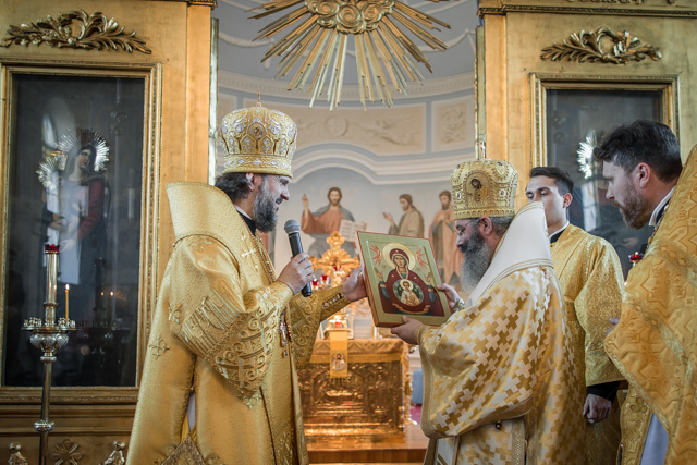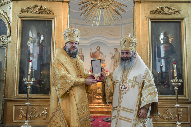 После литургии владыка ректор приветствовал гостей и поблагодарил епископа Николая и сопровождающих его архимандрита и иеромонаха за совместное служение. На молитвенную память он преподнес в дар епископу Николаю написанную в Иконописном отделении икону Божией Матери "Знамение" и панагию с Владимирским образом Пресвятой Богородицы. В свою очередь амафунтский архиерей подарил ректору Духовной Академии образ святителя Тихона Амафунтского и передал от митрополита Лимассольского Афанасия панагию с образом Христа Спасителя. Архиепископ Амвросий приветствовал священника Антония Копаева с днем личной Пятидесятницы: