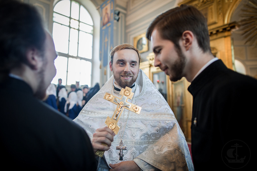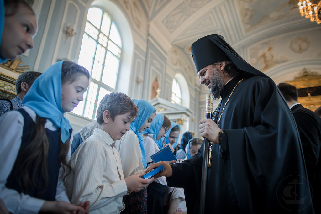 Справка: За Божественной литургией архиепископу Амвросию и епископу Николаю сослужили: архимандрит Исаак (Пантелеи), проректор по воспитательной работе иеромонах Марк (Святогоров), иеромонах Варнава (Христоулидис), священник Владимир Гончаренко, иеромонах Геннадий (Поляков), священник Варфоломей (Магницкий), священники Александр Кузнецов и Глеб Санюк, клирик храма святителя Иннокентия Московского г. Москвы священник Глеб Седов, иеромонахи Феодосий (Желновачев), Лука (Пронских), Онуфрий (Сонькин) и Феофан (Друганов), священники Климент Нехамаийа и Антоний Копаев; протодиакон Кирилл Журавлев, иеродиаконы Иоанн (Галумов), Димитриан (Петца) и Филарет (Гащук), диаконы Михаил Волков и Максим Марков, иеродиакон Павел (Полевой), диакон Константин Суржиков. Проповедь после запричастного стиха произнес аспирант Александр Андреев. За богослужениями пели три хора Духовной Академии: мужской под управлением чтеца Марка Качанкина, смешанный под руководством монахини Ксении (Каньшиной) и женский под управлением Лидии Масловой. Несколько произведений исполнил детский хор воскресной школы при храме святителя Иннокентия Московского г. Москвы. После Литургии архиепископ Амвросий встретился с воспитанниками школы и вручил им сладкие подарки. За всенощным бдением накануне воскресного дня молились студенты Военно-медицинской Академии во главе с начальником финансово-экономической службы Н. И. Азаровой. После богослужения владыка ректор пообщался с курсантами и вручил им памятные подарки. В храме Двенадцати апостолов всенощное бдение и Литургию совершил секретарь Ученого совета иеромонах Никодим (Хмыров) в сослужении диакона Павла Сун Мин и иеродиаконов Агафангела (Кочеткова) и Никона (Касярума). Проповедь после запричастного стиха произнес студент 4 курса бакалавриата Дионисий Спижавка. За богослужением пел квартет смешанного хора.