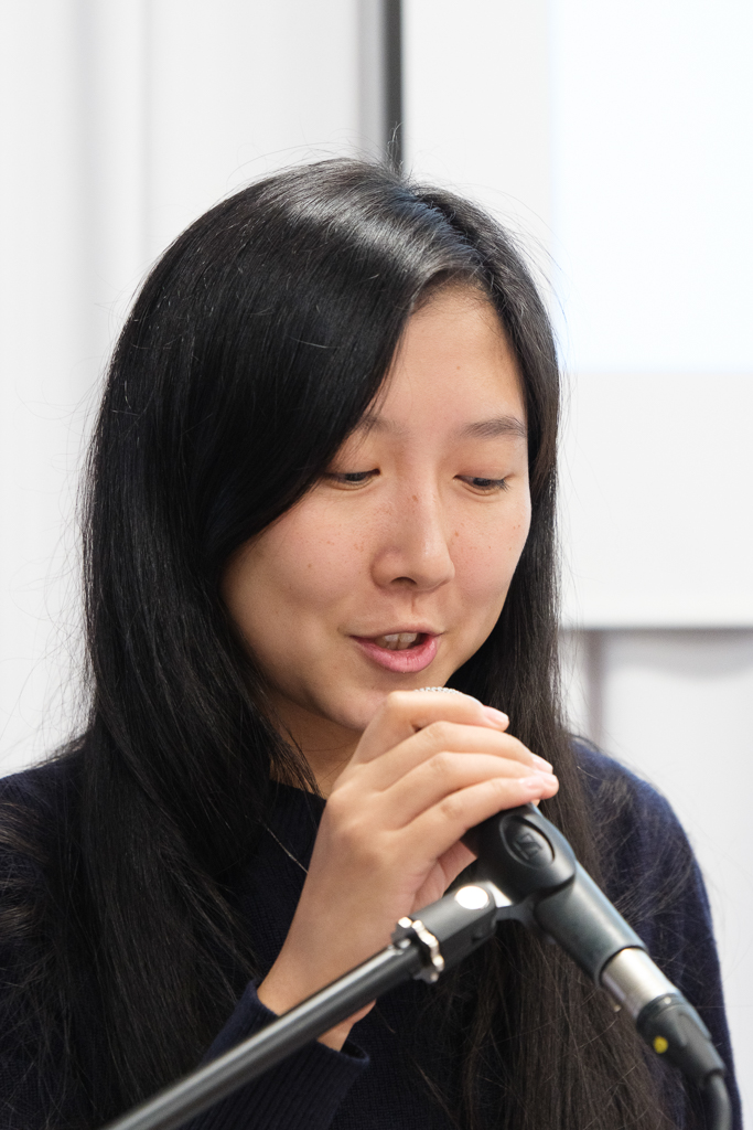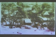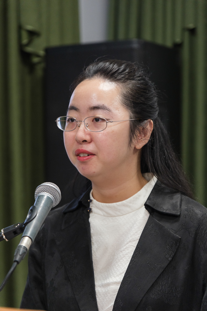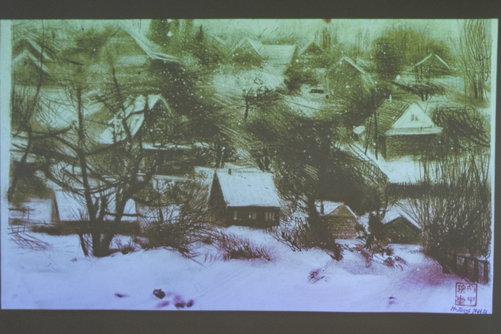 Студентка Академии художеств Ху Чжонь Юнь выступила с сообщением "От Максимова до наших дней: диалог с натурой в Староладожском пейзаже. Опыт современного пленэра". Она отметила, что сюжеты художник брал из жизни, на его полотнах - Старая Ладога, Чернавино, Любша и другие деревни. Крестьянскую жизнь он живописал с этнографической точностью. Она показала свой графический триптих, изображающий места, хорошо известные Максимову. Русский пейзаж она создала в традиционной китайской технике гохуа. Художница рассказала, что поскольку пленэр проходил зимой и было очень холодно, на улице она намечала только общую композицию, а прорабатывала уже в помещении. Во время практики студенты создавали не только пейзажи, но и портреты насельников обители. Их работы выставлялись в Союзе художников.