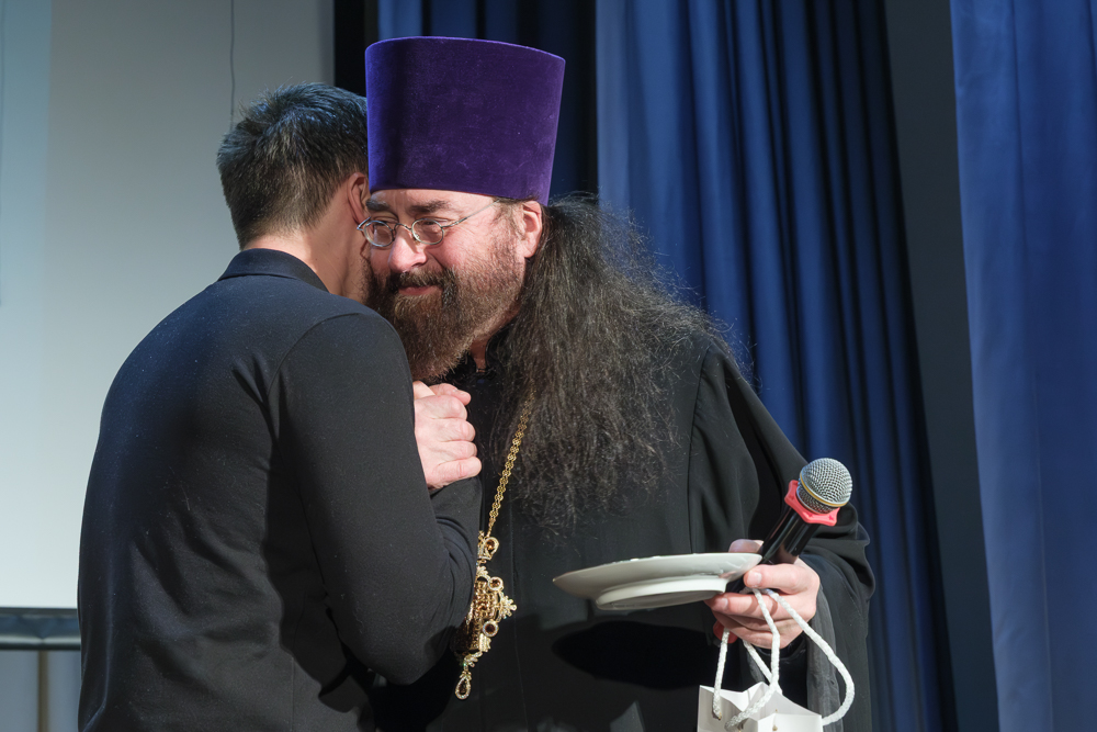 В завершение вечера Михаил Калинин вручил протоиерею Вячеславу Харинову специальный приз ИФЗ и Монетного двора.