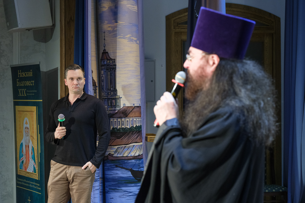 Были показаны два отрывка из фильма "Имена и судьбы", который еще не закончен. Отец Вячеслав подчеркнул, что специально включил в фильм истории людей разных национальностей. Нынешним летом он поехал в Белоруссию. Первый сюжет связан с мемориалом "Прорыв" в Ушачском районе. Отец Вячеслав рассказал об одной из сомнительных фигур прошедшей войны: Владимир Гиль-Родионов, советский офицер, попал в плен и организовал роту эсэсовцев, отличавшуюся особой жестокостью. Затем он перешел на сторону Красной Армии и даже был удостоен звания Героя Советского Союза. Отец Вячеслав высказал предположение, что его возвращение к своим не было актом переосмысления, раскаяния - скорее всего, он был беспринципным человеком и просто делал то, что выгодно в данный момент. Контрастом к этой истории стал рассказ о жизни и подвиге майора Петра Гаврилова, героического защитника Брестской крепости.