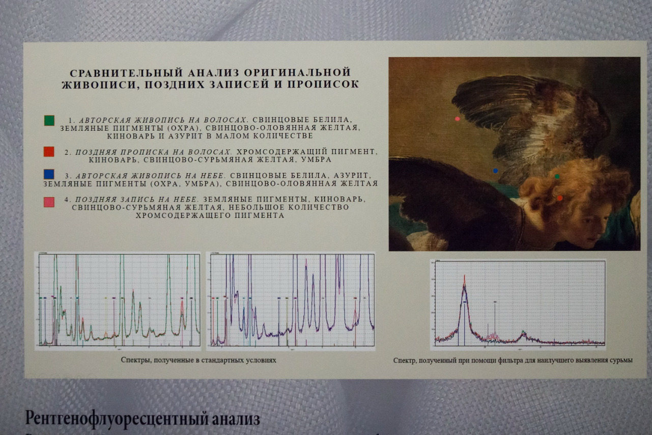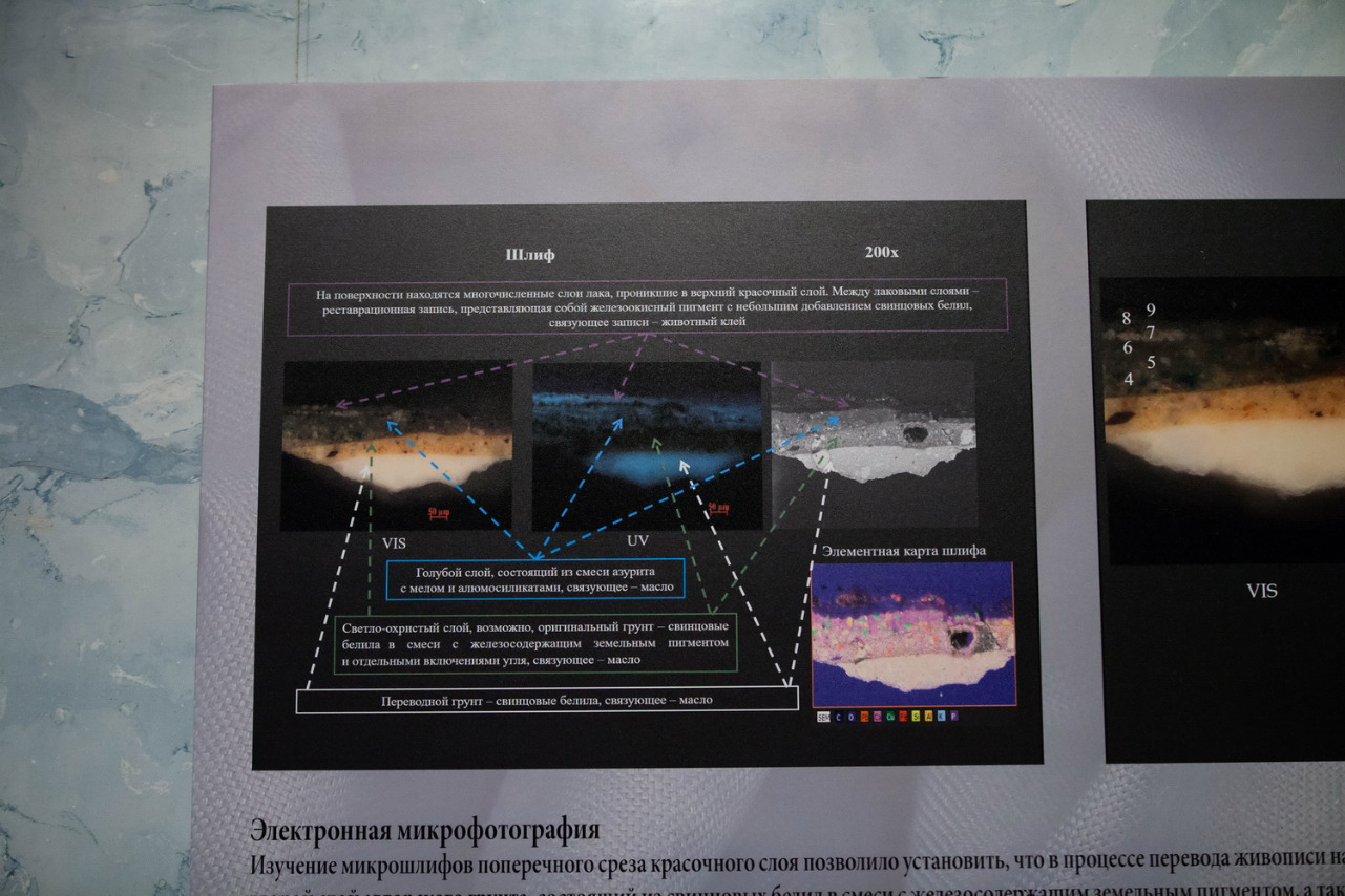 В экспозиции также представлены снимки картины в ультрафиолетовых и инфракрасных лучах, под стереомикроскопом, и электронные микрофотографии, сделанные на различных этапах исследовательской и реставрационной работы.