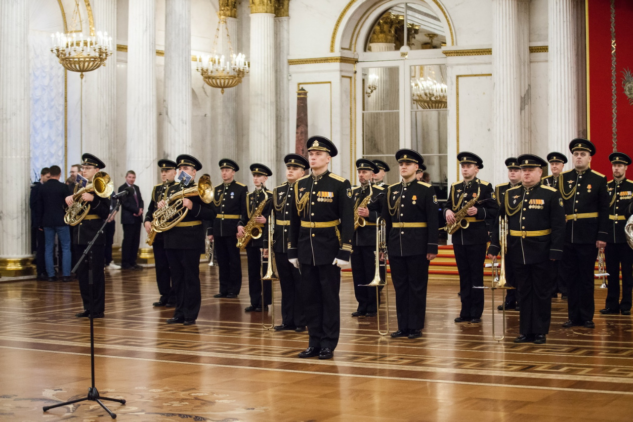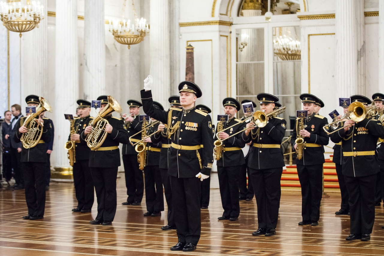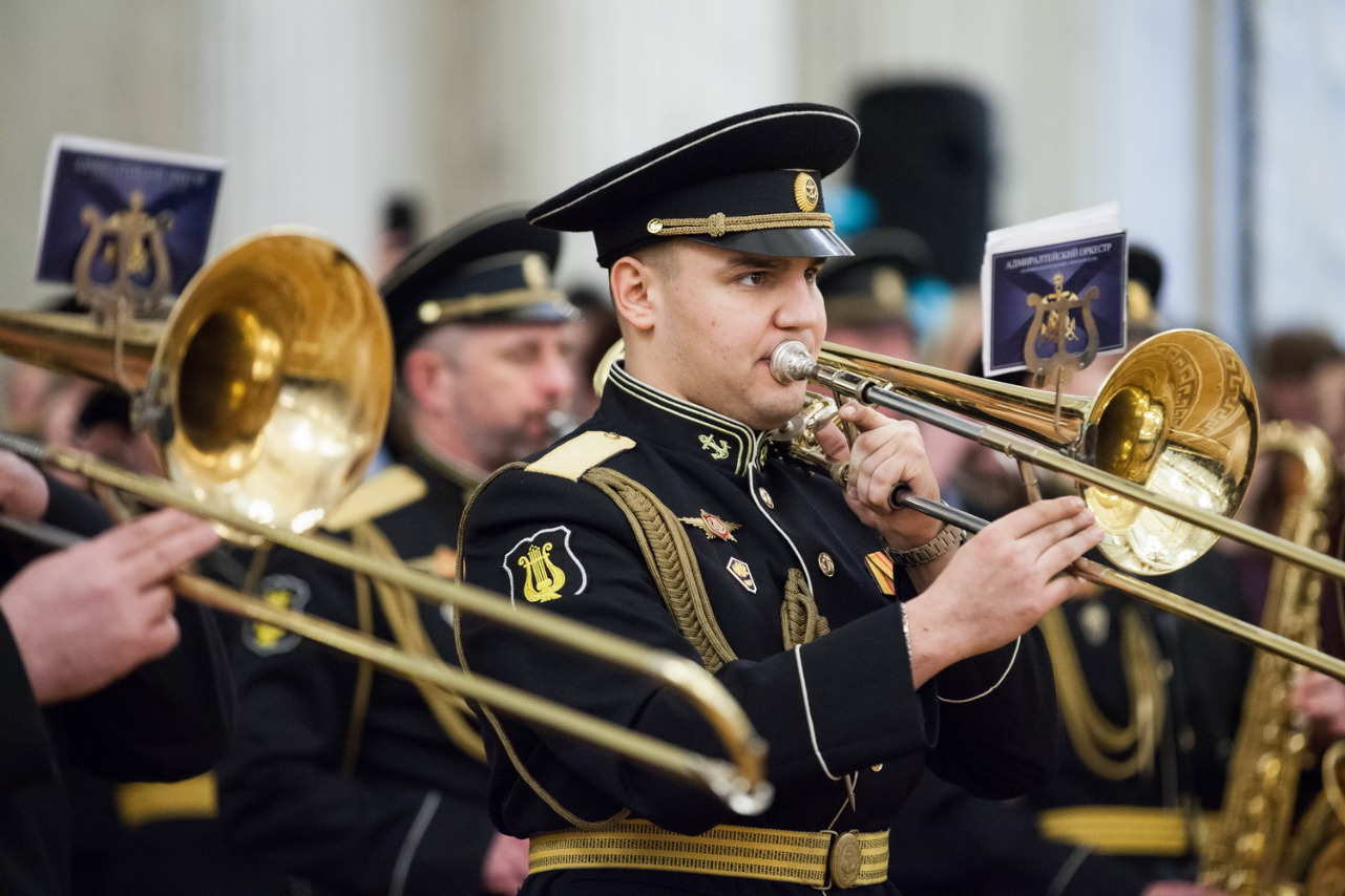 В исполнении Адмиралтейского оркестра Ленинградской военно-морской базы под управлением Никиты Игнатова прозвучали "Марш лейб-гвардии Преображенского полка", "Фанфара 300-летия Адмиралтейства" Михаила Балканского; "Гимн Великому городу" Рейнгольда Глиэра, марш "Да здравствует Санкт-Петербург!" Франца фон Блона. Гимн Эрмитажа - песню Александра Городницкого "Атланты" - исполнил Денис Яковлев в сопровождении оркестра.