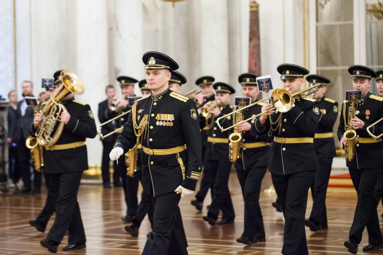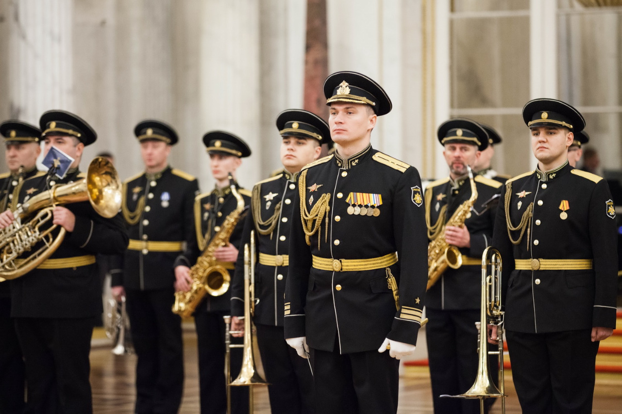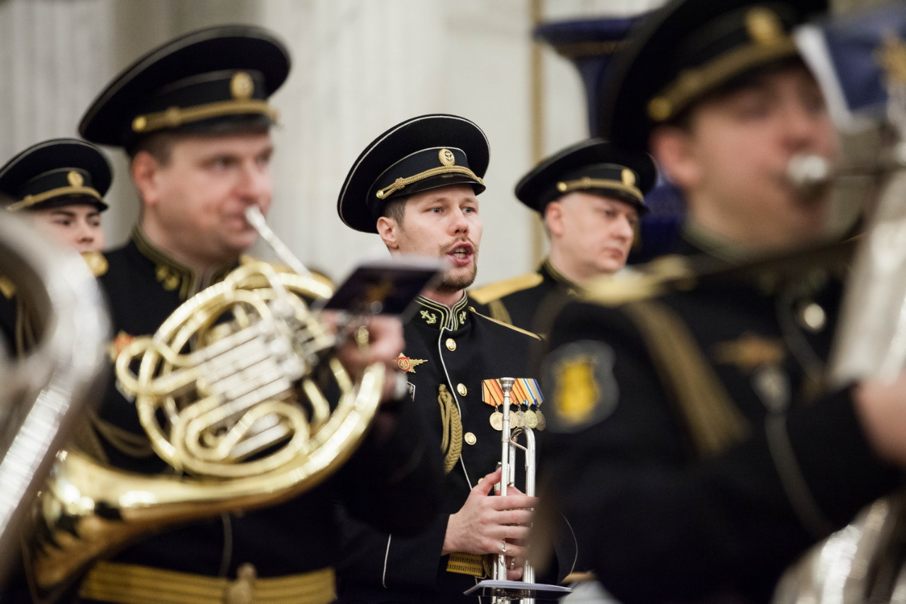 В исполнении Адмиралтейского оркестра Ленинградской военно-морской базы под управлением Никиты Игнатова прозвучали "Марш лейб-гвардии Преображенского полка", "Фанфара 300-летия Адмиралтейства" Михаила Балканского; "Гимн Великому городу" Рейнгольда Глиэра, марш "Да здравствует Санкт-Петербург!" Франца фон Блона. Гимн Эрмитажа - песню Александра Городницкого "Атланты" - исполнил Денис Яковлев в сопровождении оркестра.