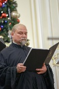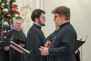 Прозвучала стихира из службы святителю Николаю Чудотворцу "Благий рабе и верный" на музыку Алексея Астафьева. Солировал епархиальный протодиакон Андрей Левин.