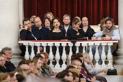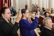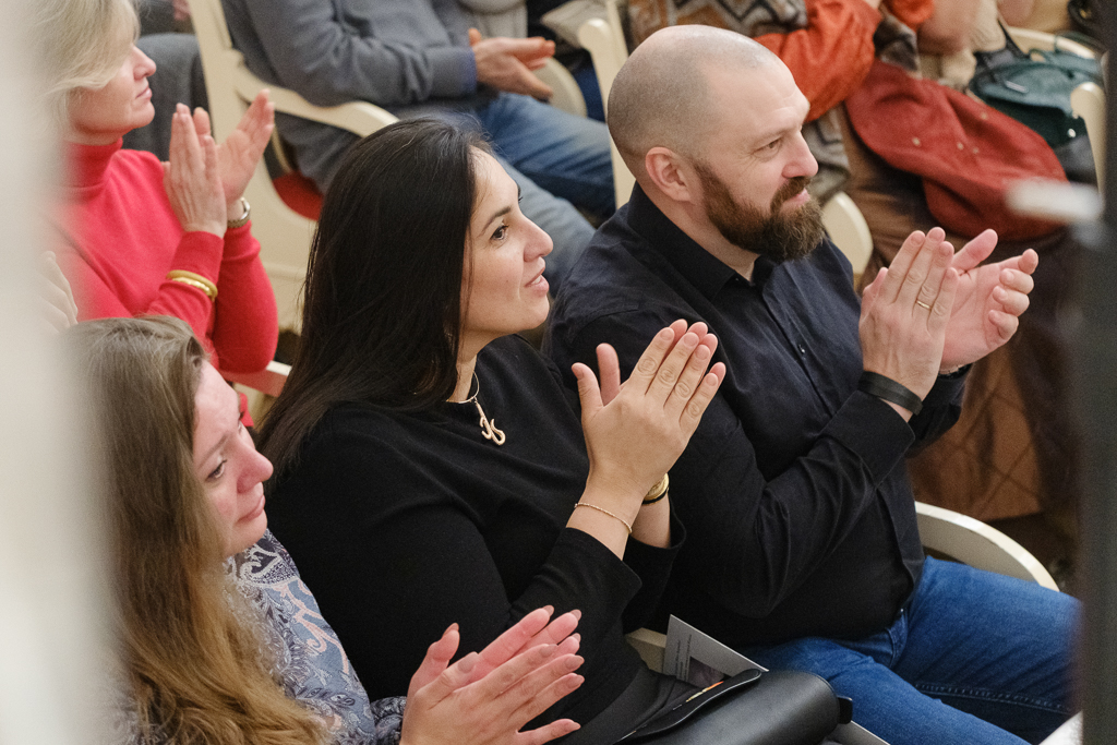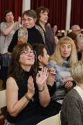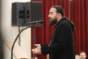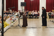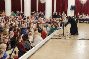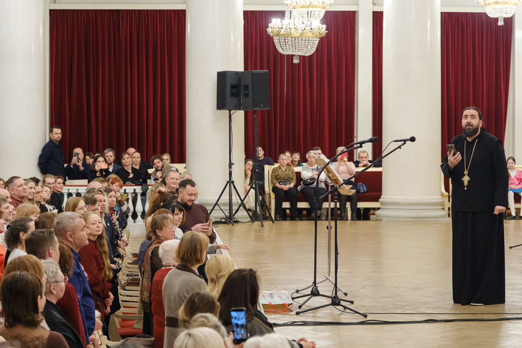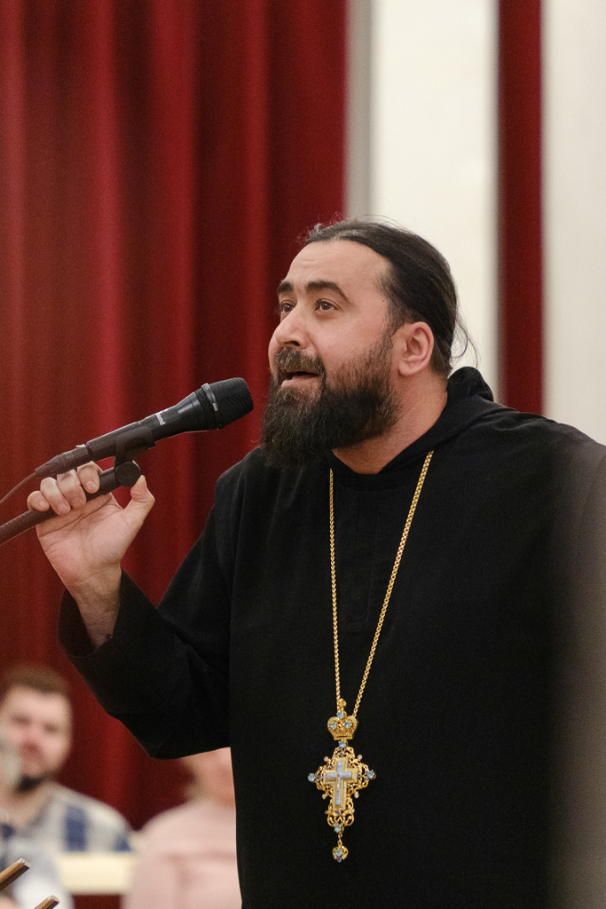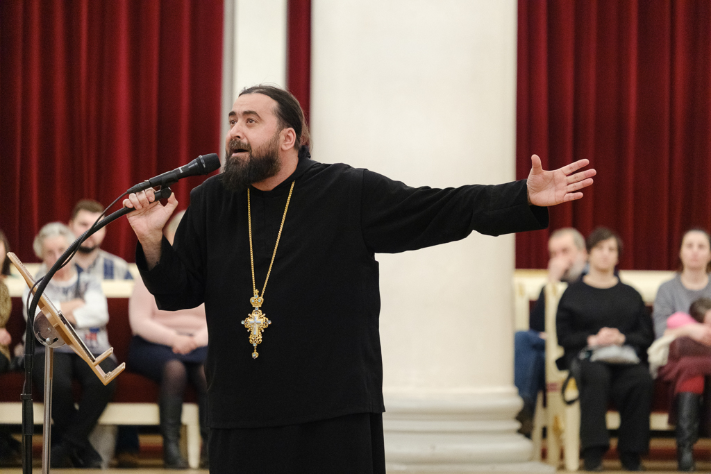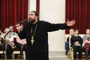 Отец Серафим рассказал, что многое исполняется экспромтом: хор репетирует, но ни он, ни певчие до конца не знают, что получится. Отвечая на вопрос из зала, он сказал, что музыкального образования нет ни у него, ни у участников хора.
