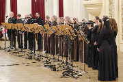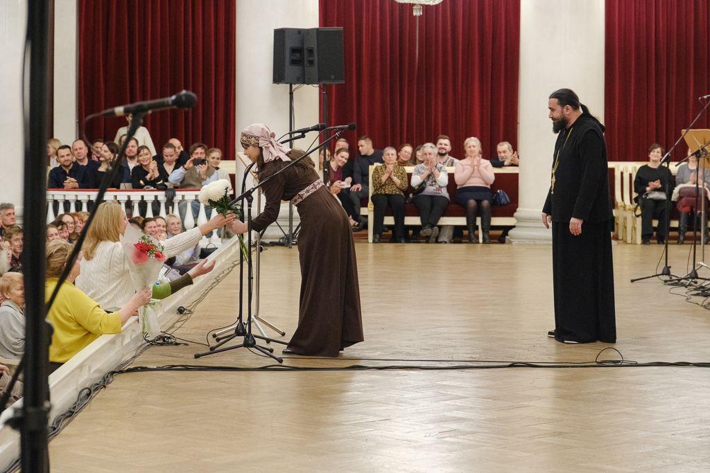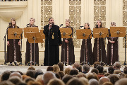 Программу открыл ансамбль древнерусской духовной музыки "Знамение" под руководством Татьяны Швец (кафедра древнерусского певческого искусства Санкт-Петербургской консерватории имени Николая Римского-Корсакова). Прозвучали песнопения из рукописей XVII - XVIII веков: ирмос канона Рождества Христова (знаменный распев), духовный стих "Пресветлый ангел мой Господень" (солист - Татьяна Швец), партесная гармонизация греческого распева "Достойно есть", тропарь Пасхи (демественный распев и демественное многоголосие).