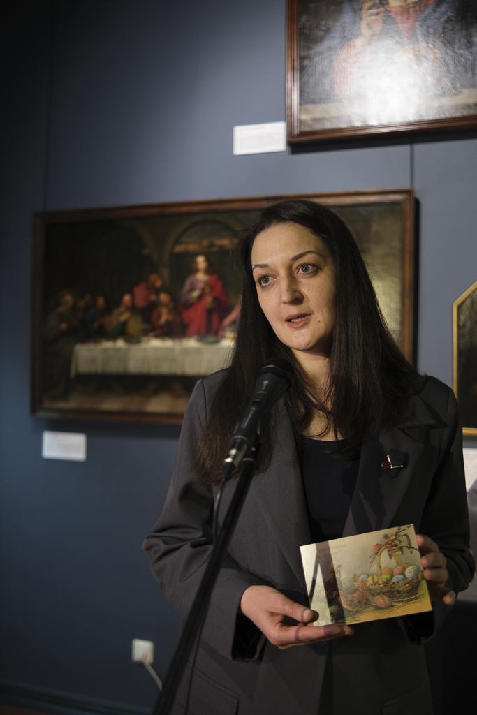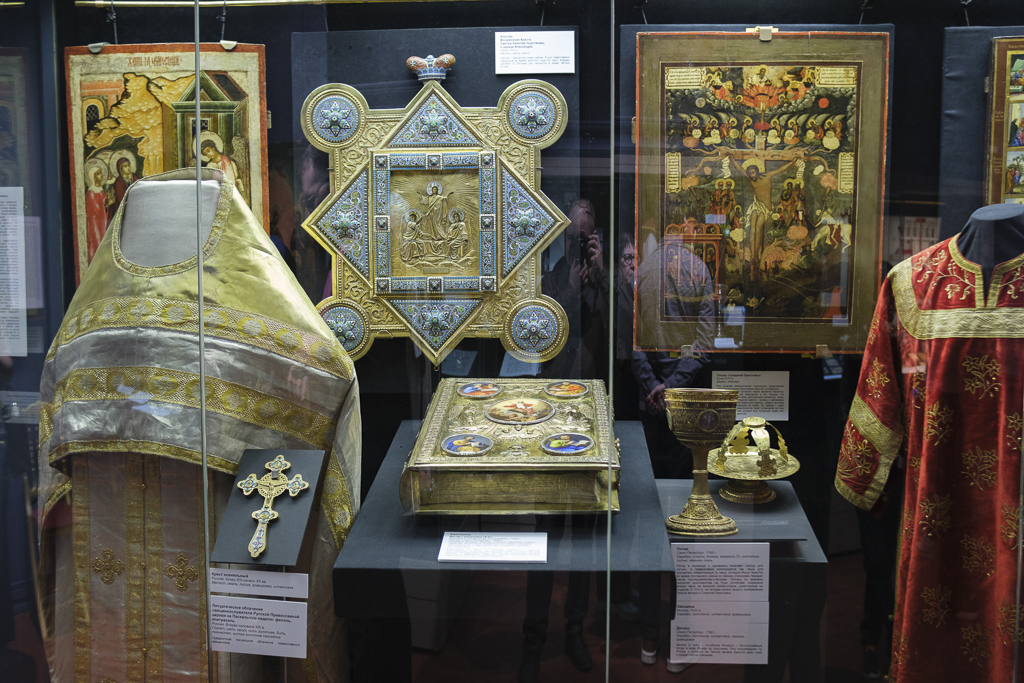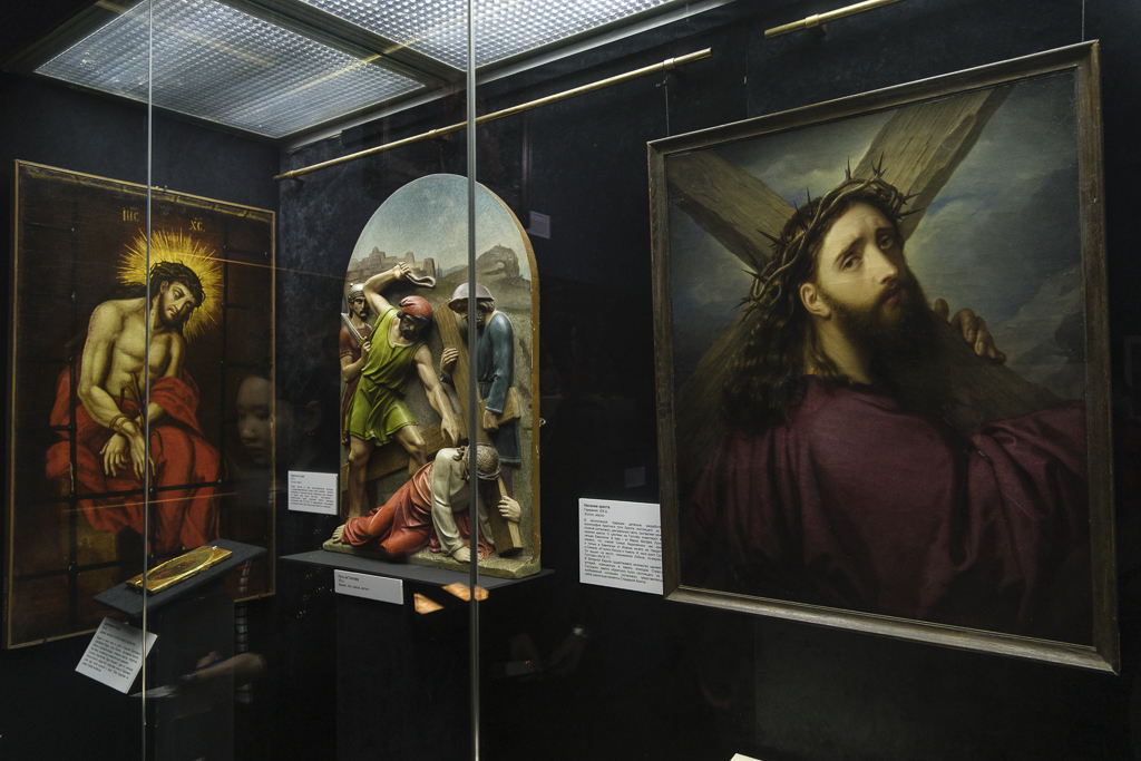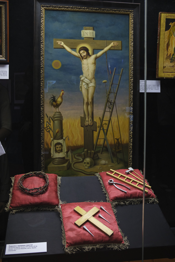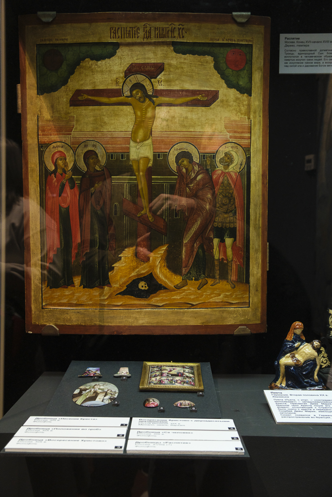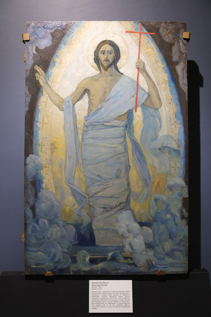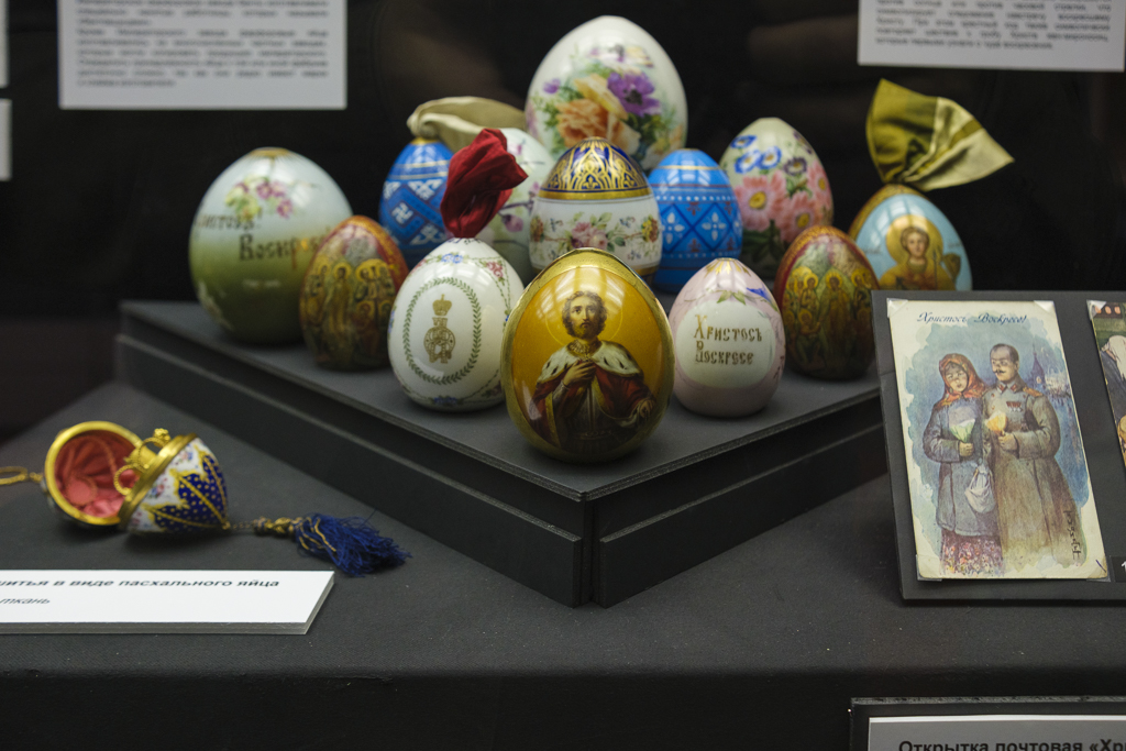 Среди экспонатов - полотно Михаила Нестерова "Воскресение Христа" (1922), пасхальные яйца из фарфора (XIX в.), яркие пасхальные открытки, три пасхальных стола, на которых представлены иудейский седер, православная и католическая праздничные трапезы.