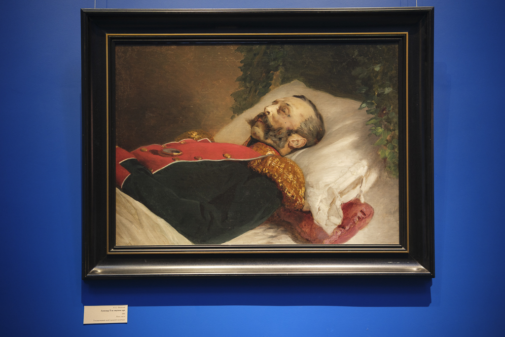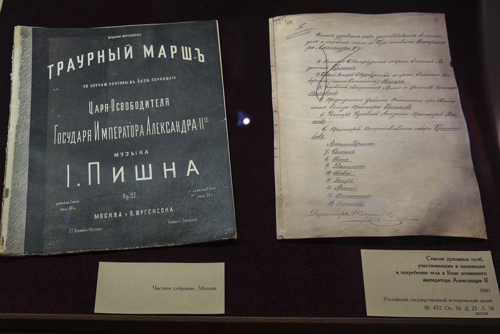 Представлен посмертный портрет Александра II, написанный Константином Маковским через несколько часов после трагедии, архивные документы, в том числе печатный экземпляр одного из вариантов траурного марша, сочиненного в первые дни после этих событий, и мемориальные публикации в журнале "Нива".