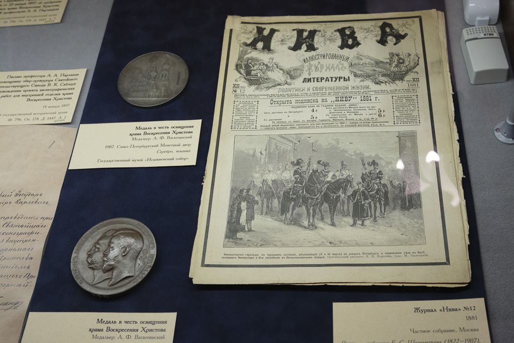 Выставка "Что было кровь, то стало храм...", приуроченная к 145-летию со дня гибели императора Александра II, открылась 14 апреля в часовне-музее храма Воскресения Христова (Спаса-на-Крови). Экспозиция рассказывает о покушении 1 марта 1881 года и возведении храма-памятника на месте трагедии. Она подготовлена при участии Музея истории религии, Музея городской скульптуры, Российского государственного исторического архива (РГИА) и частных коллекционеров.
