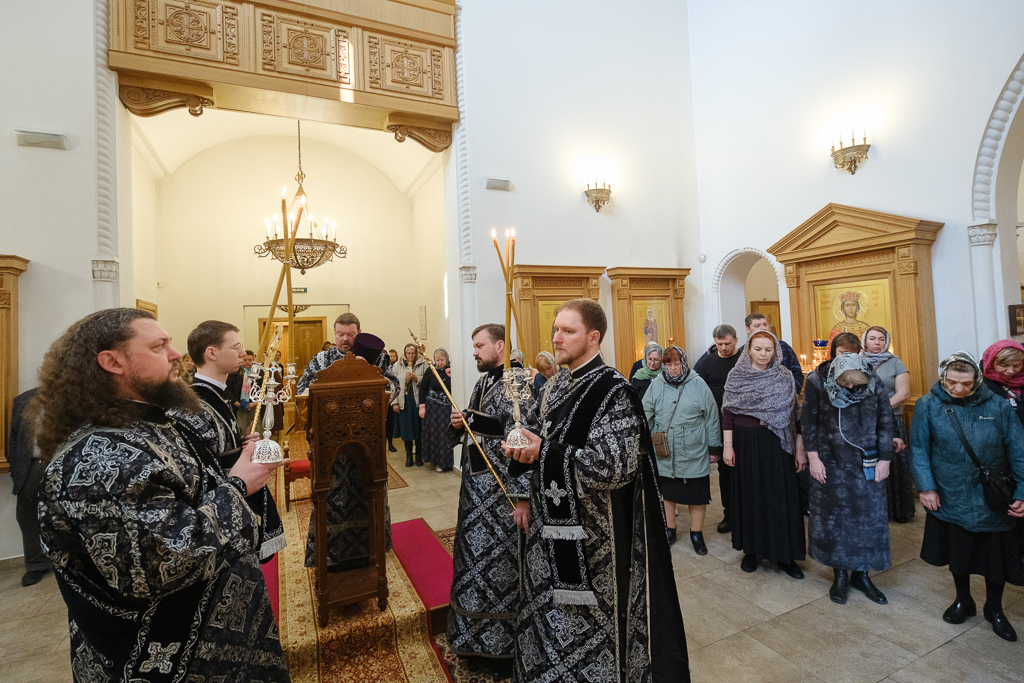 В Великую среду, 16 апреля, митрополит Санкт-Петербургский и Ладожский Варсонофий совершил Божественную литургию преждеосвященных Даров в храме преподобномученицы Евгении на Парашютной улице.