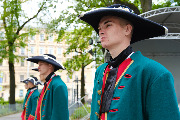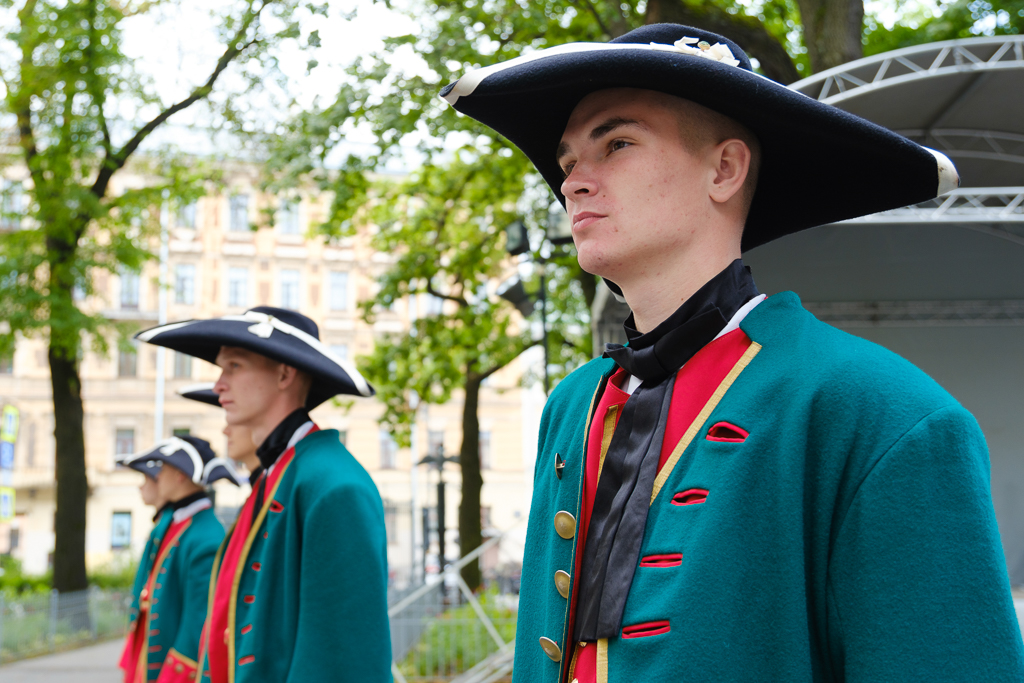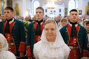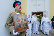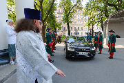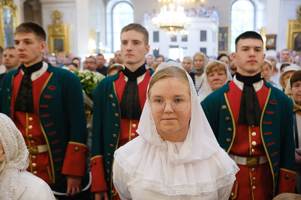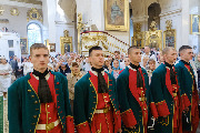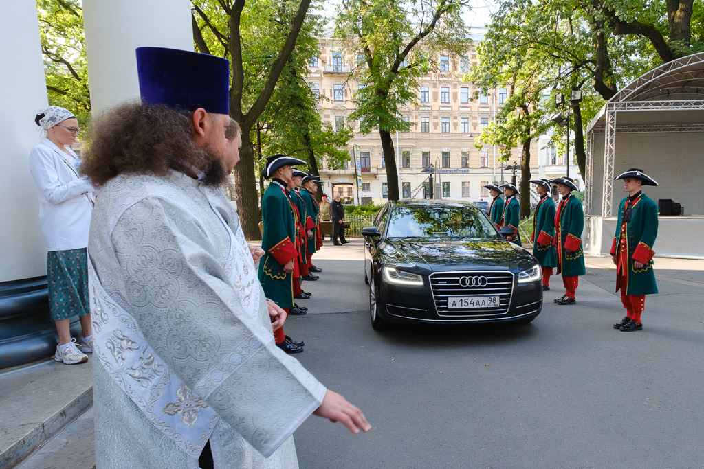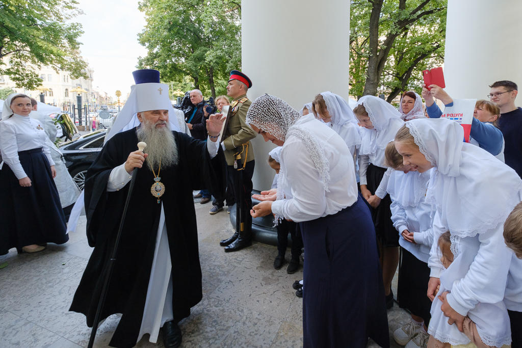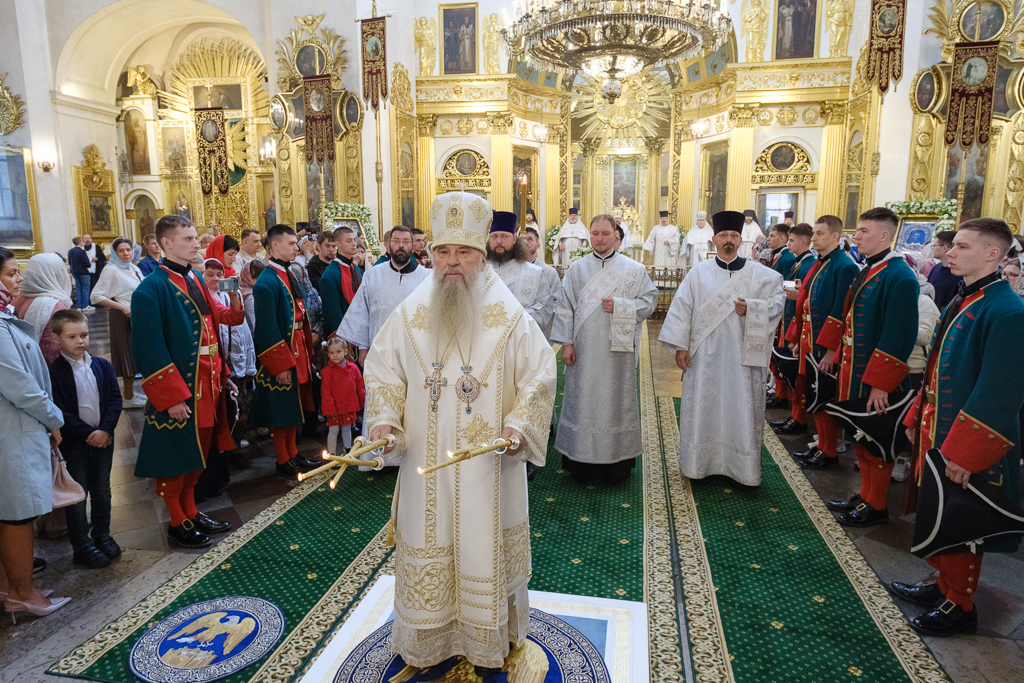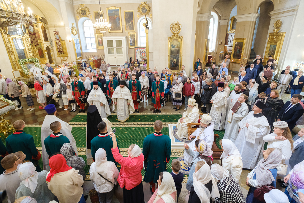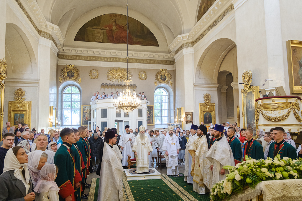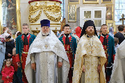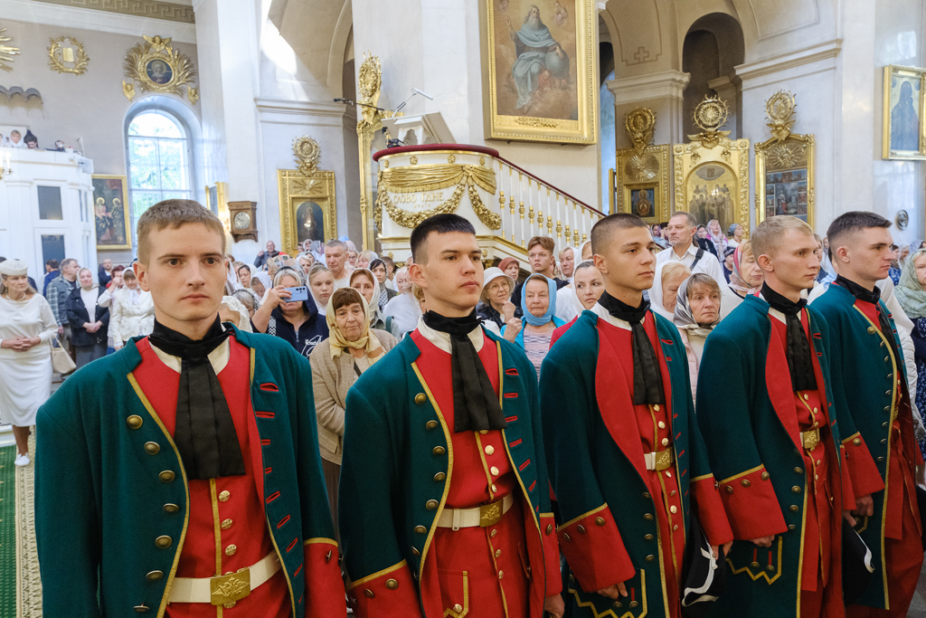 Перед входом в храм владыку встречали курсанты Михайловской военно-артиллерийской академии в мундирах исторического Преображенского полка.