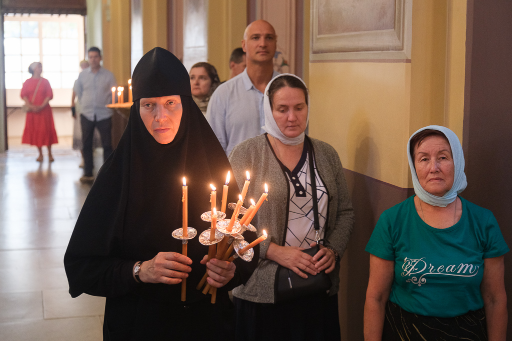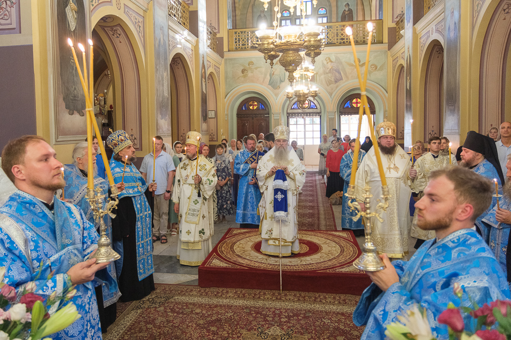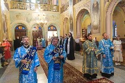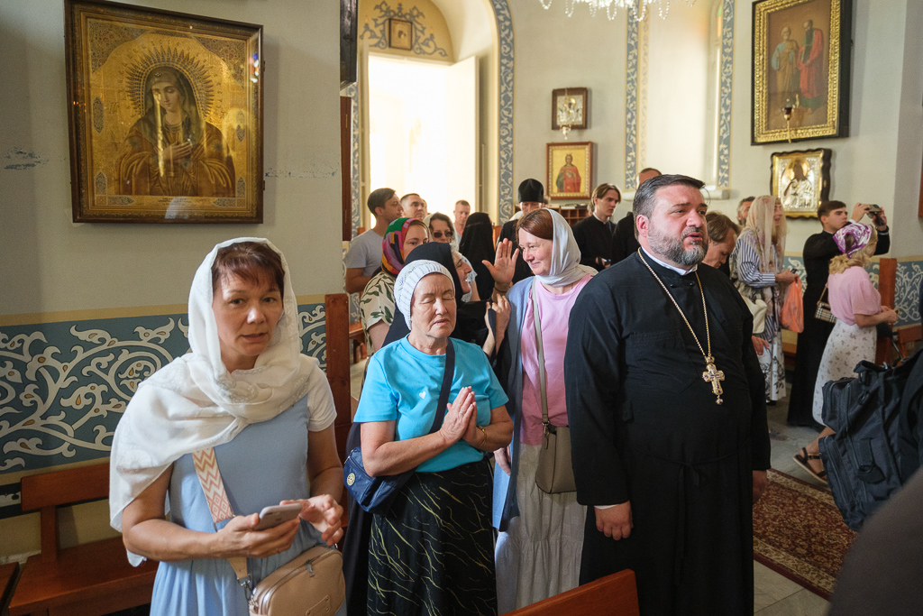 В подземном Успенском храме, расположенном недалеко от Гефсиманского сада, верующие пропели тропарь, кондак и величание Успению Богородицы, приложились к гробнице Божией Матери и чудотворной Иерусалимской Гефсиманской иконе. Группа духовенства под руководством протодиакона Андрея Левина исполнила богородичные песнопения.