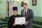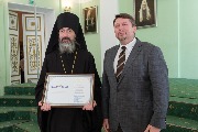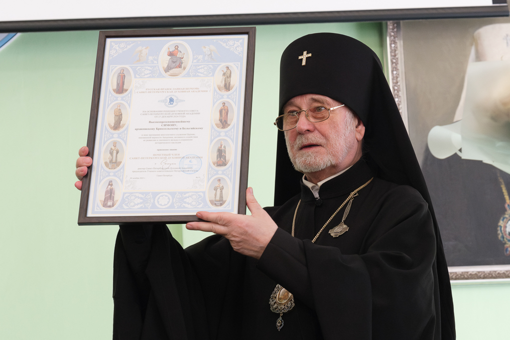 Отец Димитрий рассказал о жизненном пути архиепископа Брюссельского и Бельгийского Симона. Владыка Силуан вручил ему диплом почетного члена СПбДА.