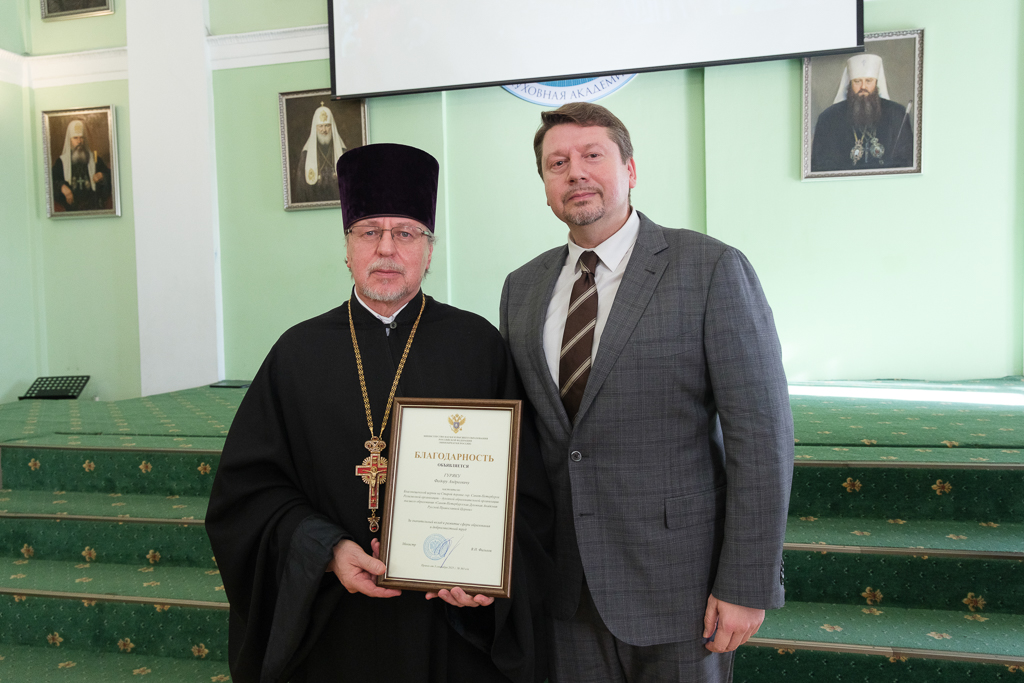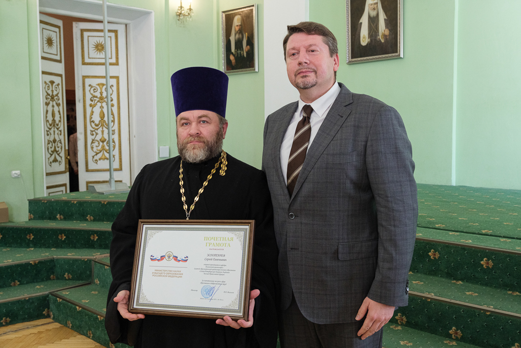 Благодарность Министерства науки и высшего образования вручена настоятелю храма Благовещения Пресвятой Богородицы на Приморском проспекте протоиерею Феодору Гуряку, нагрудным знаком "Почетный наставник" награждена профессор кафедры церковно-практических дисциплин Лариса Шеховцова. Звание "Почетный работник сферы образования РФ" присуждено завкафедрой церковной истории протоиерею Георгию Митрофанову.