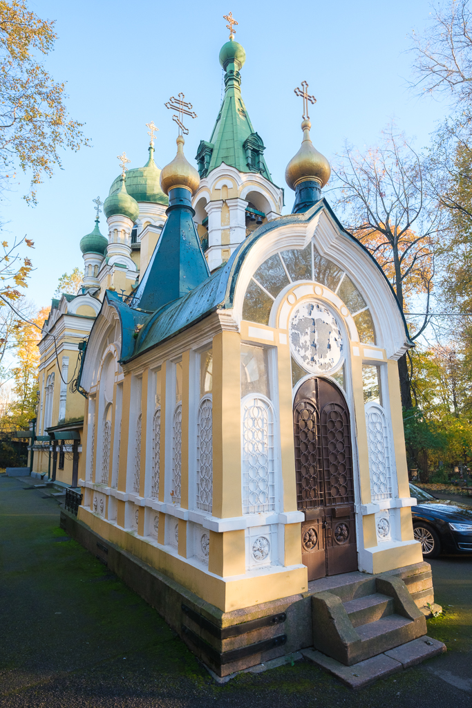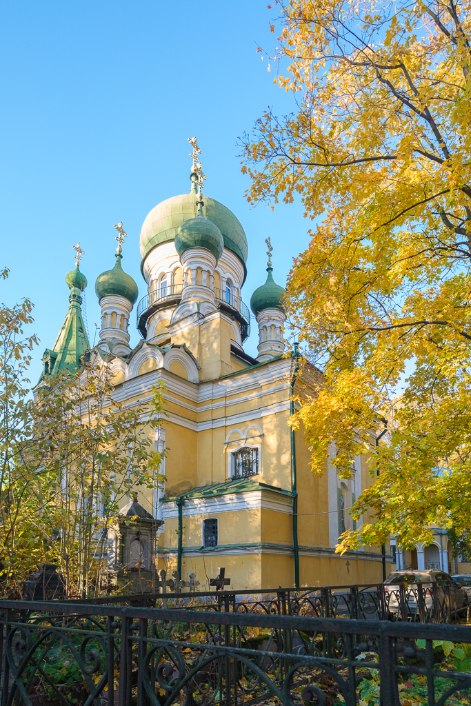 Храм праведного Иова Многострадального был построен в русском стиле по проекту Ивана Аристархова и освящен в 1887 году. Верхний храм - святого Иова, нижний - Спаса Нерукотворного Образа. Совпадение дня празднования святого Иова и дня рождения последнего российского императора (6/19 мая) послужило причиной предания о посещении церкви святой царской семьей. Не закрывался даже в дни блокады. Это единственная полностью сохранившаяся святыня из пяти храмов Волковского кладбища.