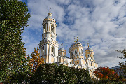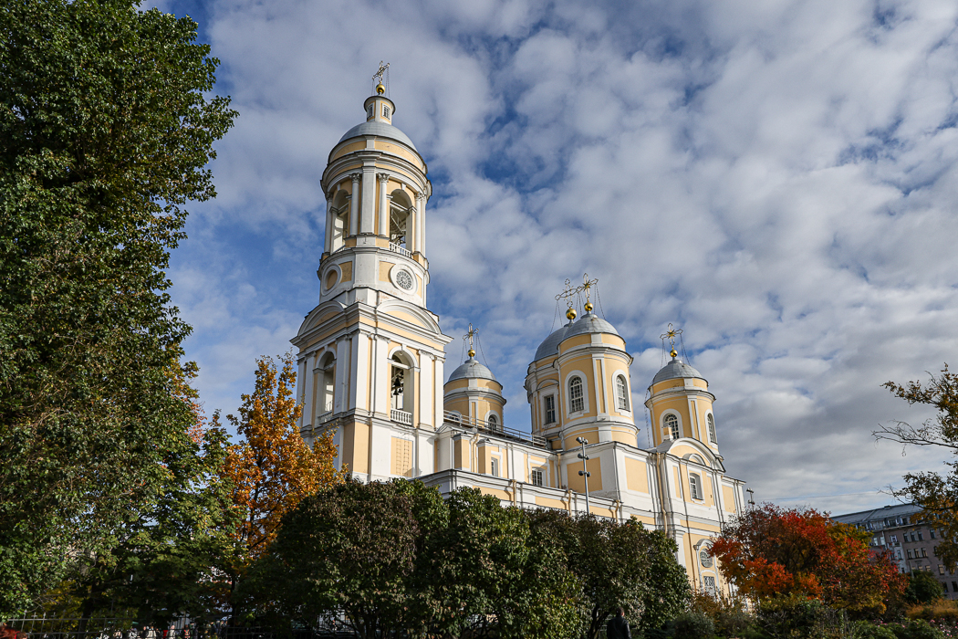 Kнязь-Владимирский собор был построен на месте деревянного Никольского храма, освященного в 1708 году при императоре Петре I и названного "на Мокруше", ибо стоял на затопляемой при наводнениях земле. Через пять лет вместо него построили мазанковую Успенскую церковь, получившую статус соборной. В 1766 году был утвержден чертеж Антонио Ринальди, в 1789-м освящен главный престол в честь 800-летия Крещения Руси, которое отмечалось годом раньше. В 1926 году храм закрыли. Через год он вновь открылся и более не закрывался. До войны служил кафедральным. Передан епархии в 1992 году.
