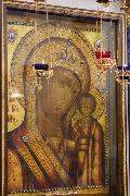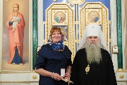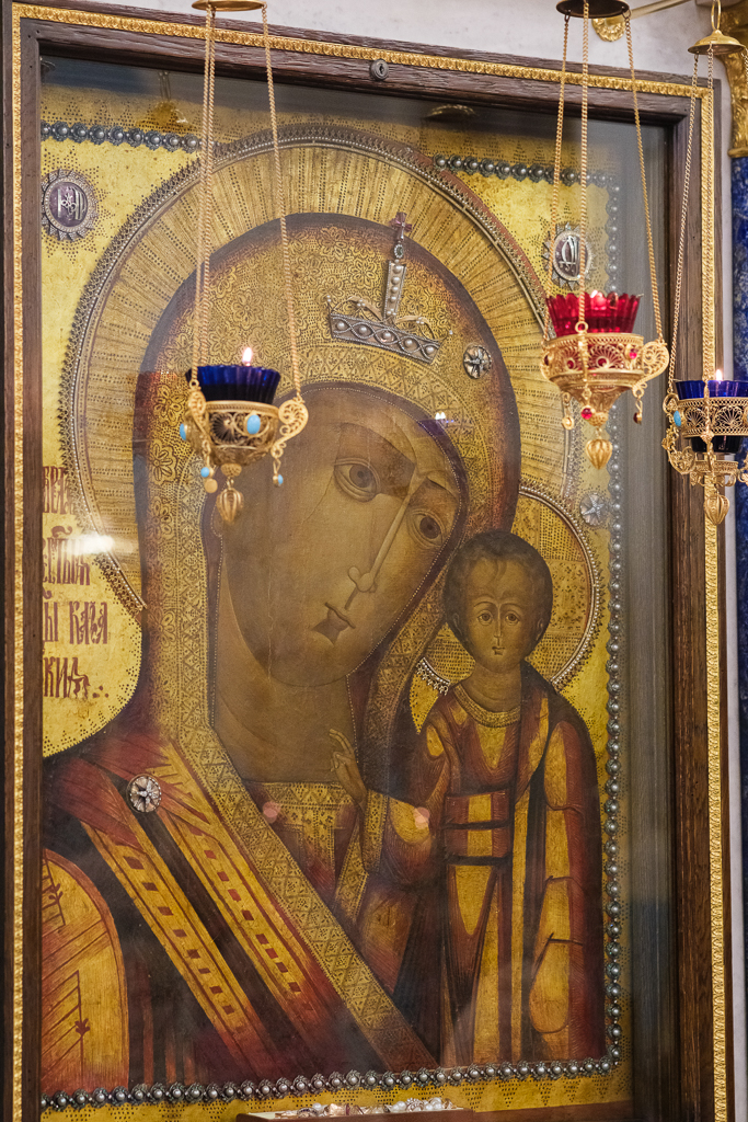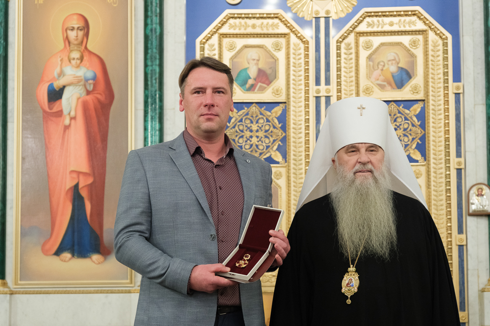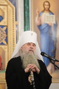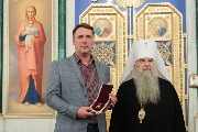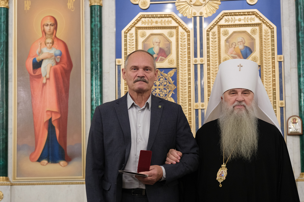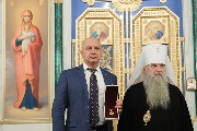 Настоятель поблагодарил губернатора за помощь в реставрации фасада храма и подарил ему Казанскую икону Божией Матери, а также поблагодарил митрополита за совместную молитву и подарил ему икону XIX века преподобного Иова Почаевского.