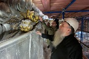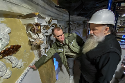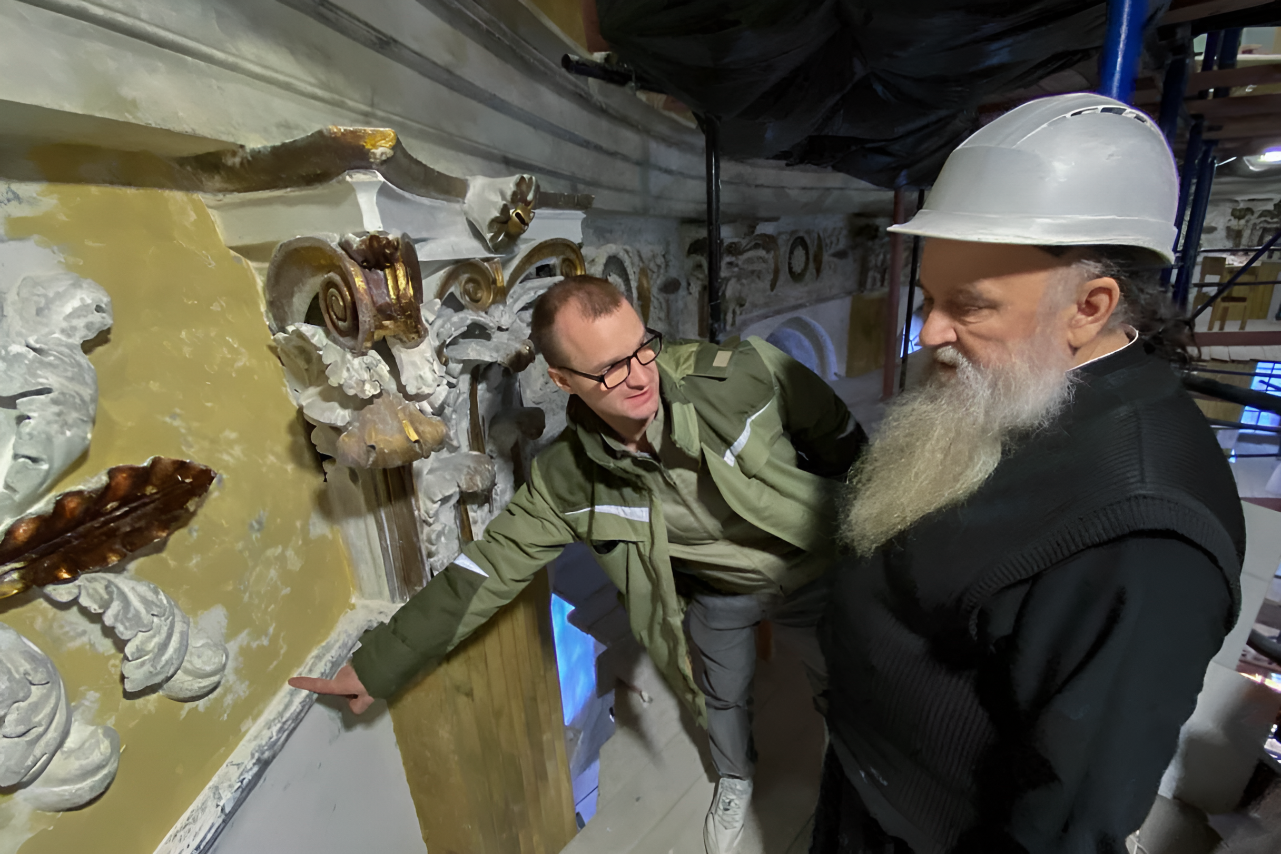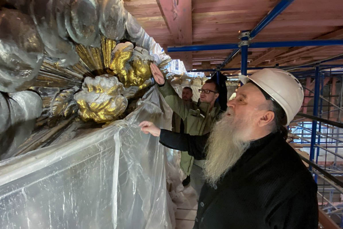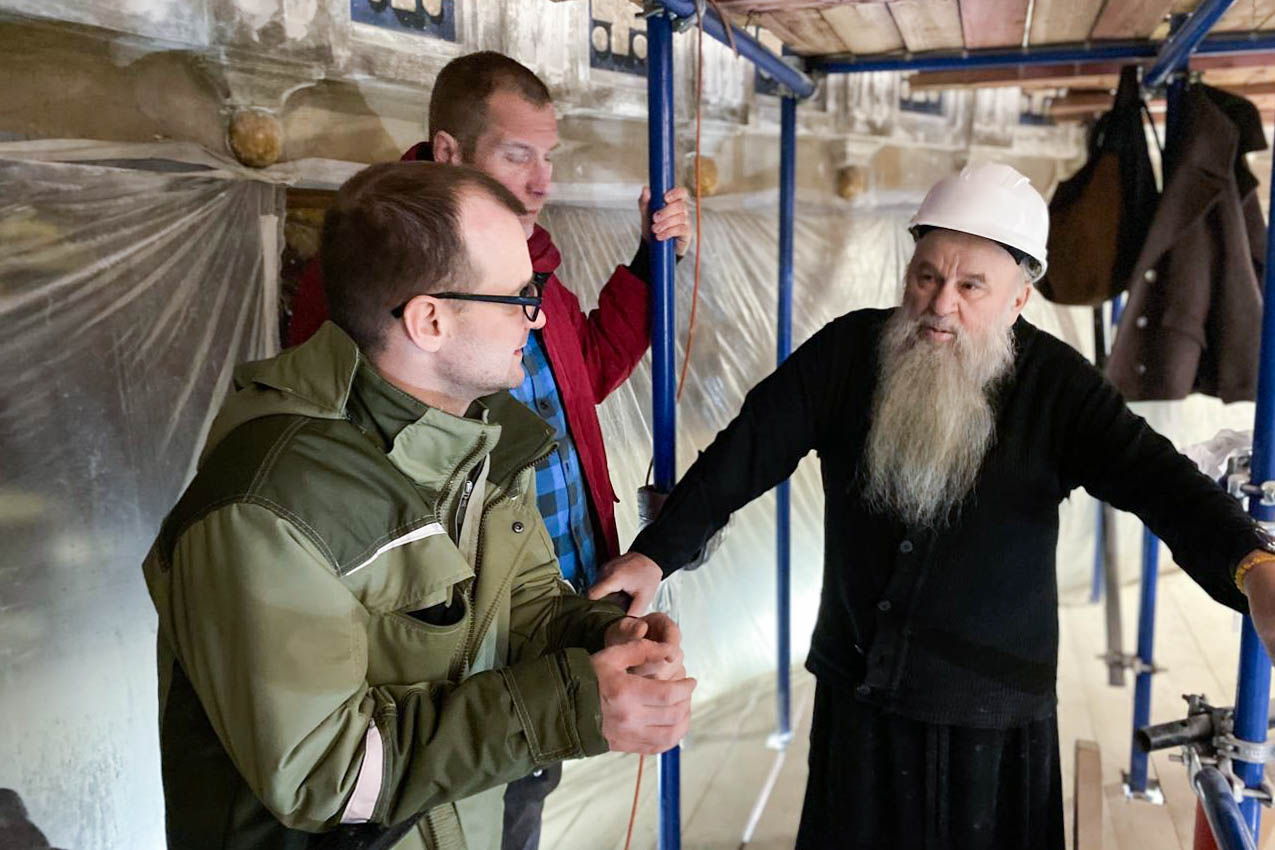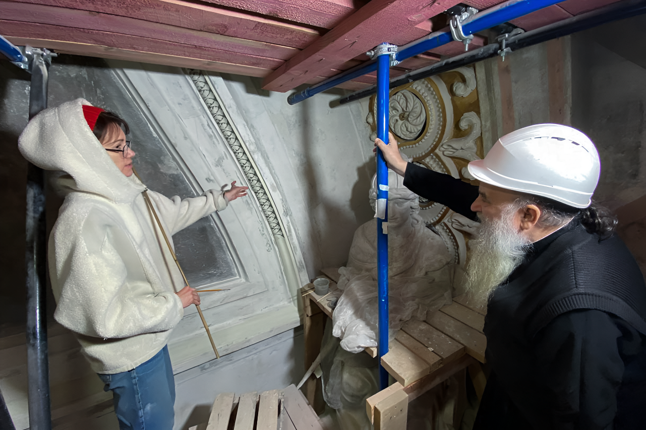 Правящего архиерея сопровождали представители подрядных организаций. Пояснения о ходе и специфике работ давали и реставраторы.