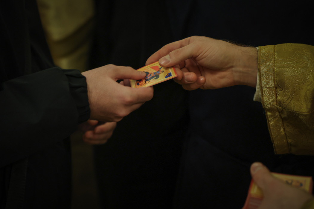 Верующим раздали иконки великомученика Георгия Победоносца.