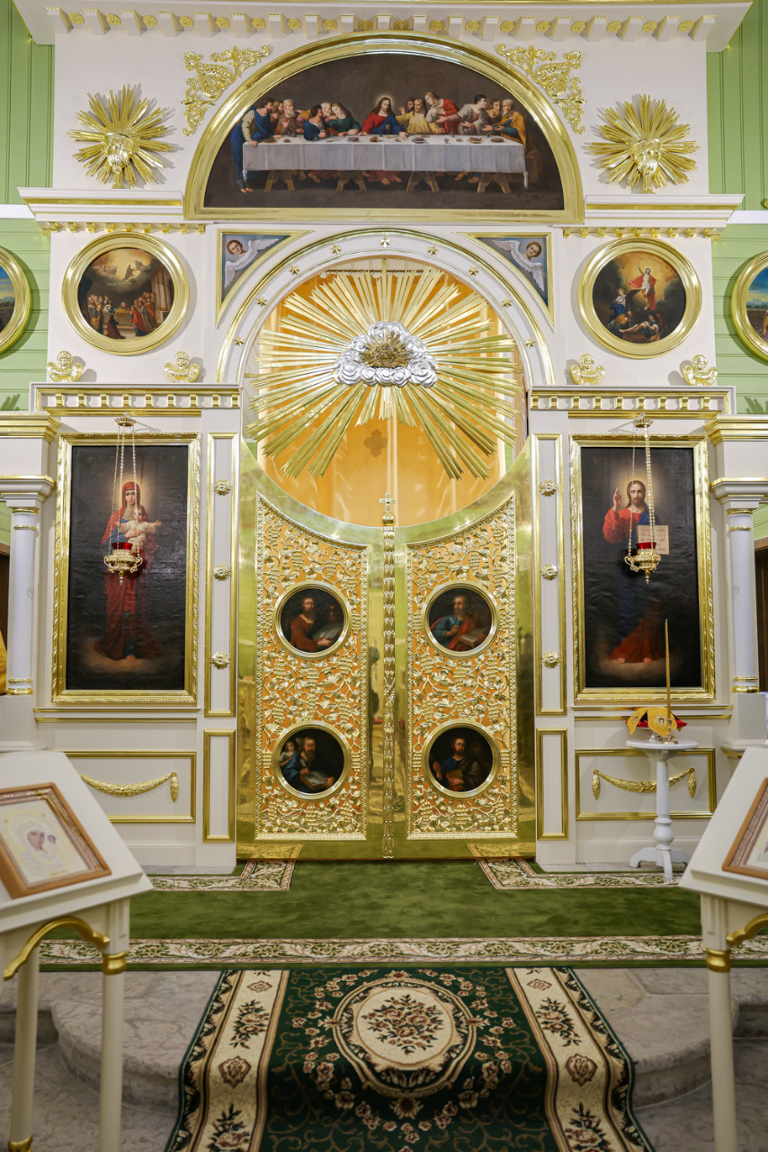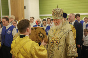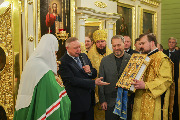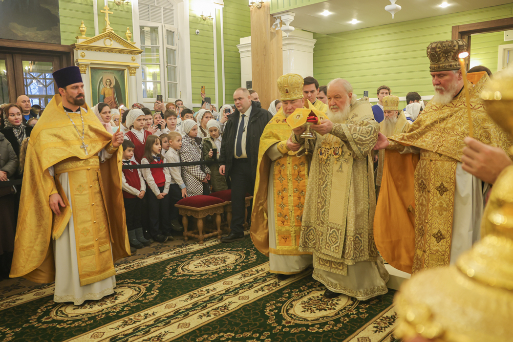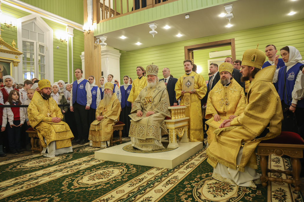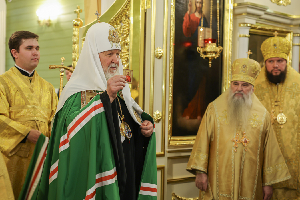 На память о богослужении Патриарх Кирилл подарил храму Смоленскую икону Божией Матери.