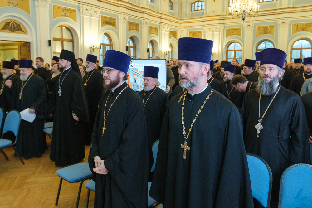 Итоговое собрание Санкт-Петербургской епархии под председательством митрополита Санкт-Петербургского и Ладожского Варсонофия прошло 16 декабря в Синем зале епархиального управления. В президиум также вошли заместитель председателя собрания епископ Кронштадтский Вениамин, епископ Петергофский Силуан, секретарь протоиерей Сергий Куксевич.