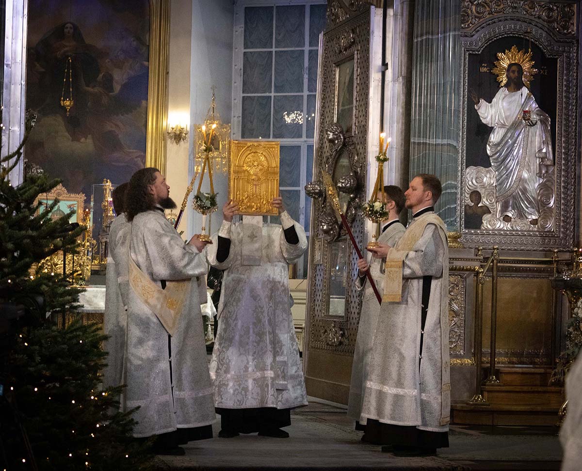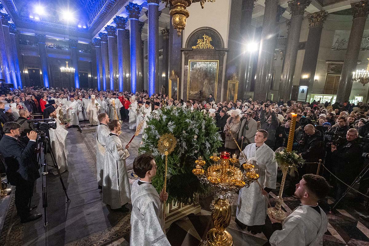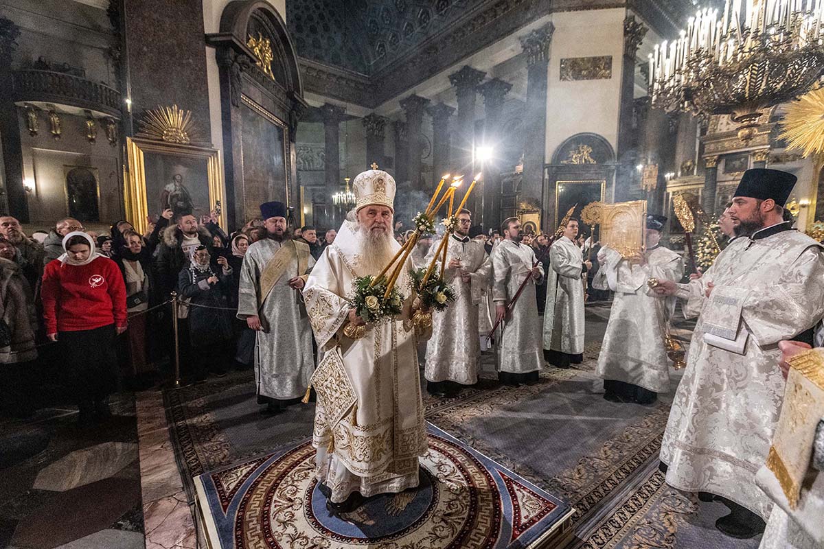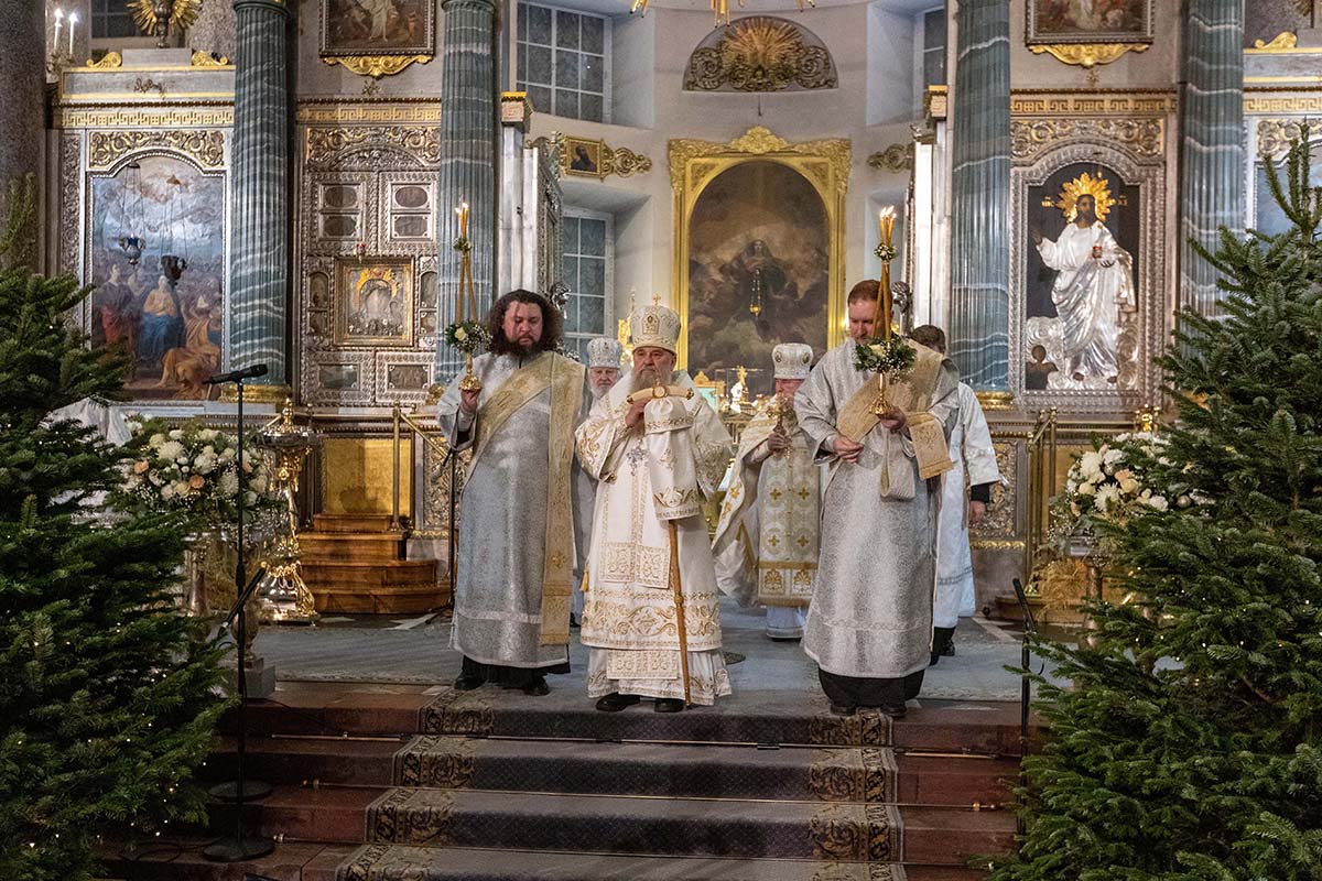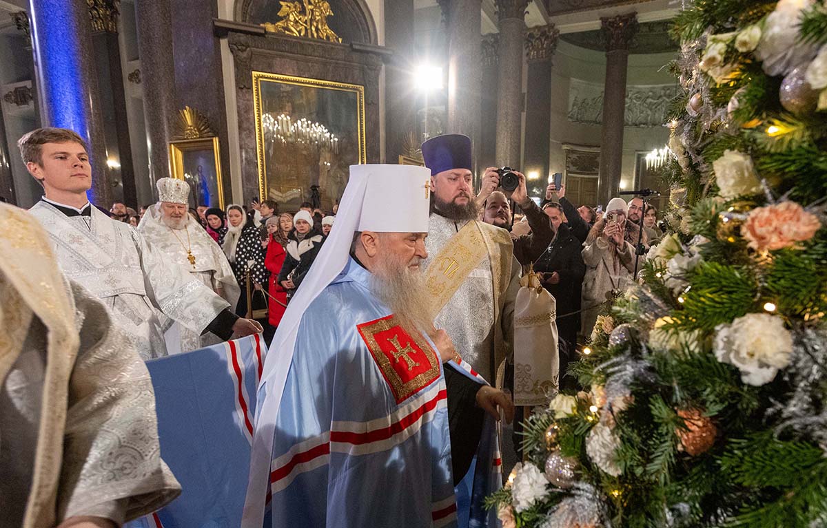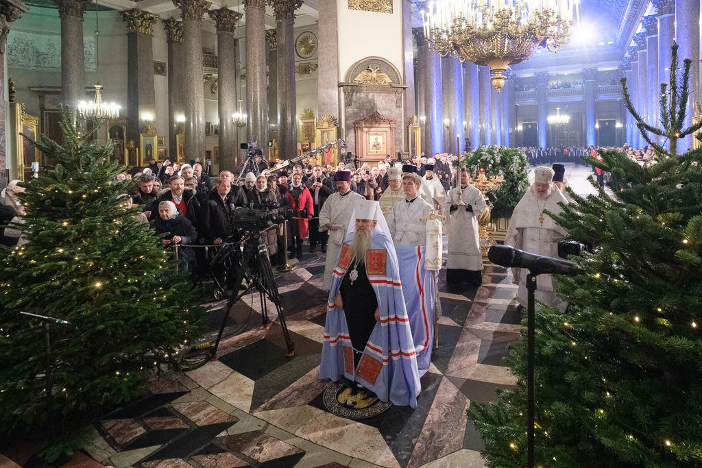 В ночь с 6 на 7 января, праздник Рождества Христова, митрополит Санкт-Петербургский и Ладожский Варсонофий возглавил великое повечерие, утреню и Божественную литургию в Казанском кафедральном соборе.