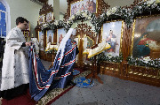 "Господь принес людям радость общения, - продолжил архипастырь. - До этого они не могли с Ним общаться, а после Рождества Христова делали это напрямую. Он сам пришел, люди могли к Нему подойти, задать вопрос, попросить исцеления. Столь близкой встречи с Ним до этого никогда не было. Многие воспользовались этой близостью и получили от Христа всякие блага. И сегодня Он рядом с нами, не покинул нас. Мы можем к Нему обращаться в молитвах, просьбах, укрепляться Его благодатью. Сегодня мы прощаемся с праздником Рождества Христова. Еще завтра побудем в Иерусалимском храме, празднуя Обрезание Господне, а потом наш взор Церковь постепенно переведет на Иордан, протекающий недалеко от Вифлеема. Но это уже будет другое событие: мы сможем лицезреть всю Живоначальную Троицу, присутствующую при Крещении Иисуса".