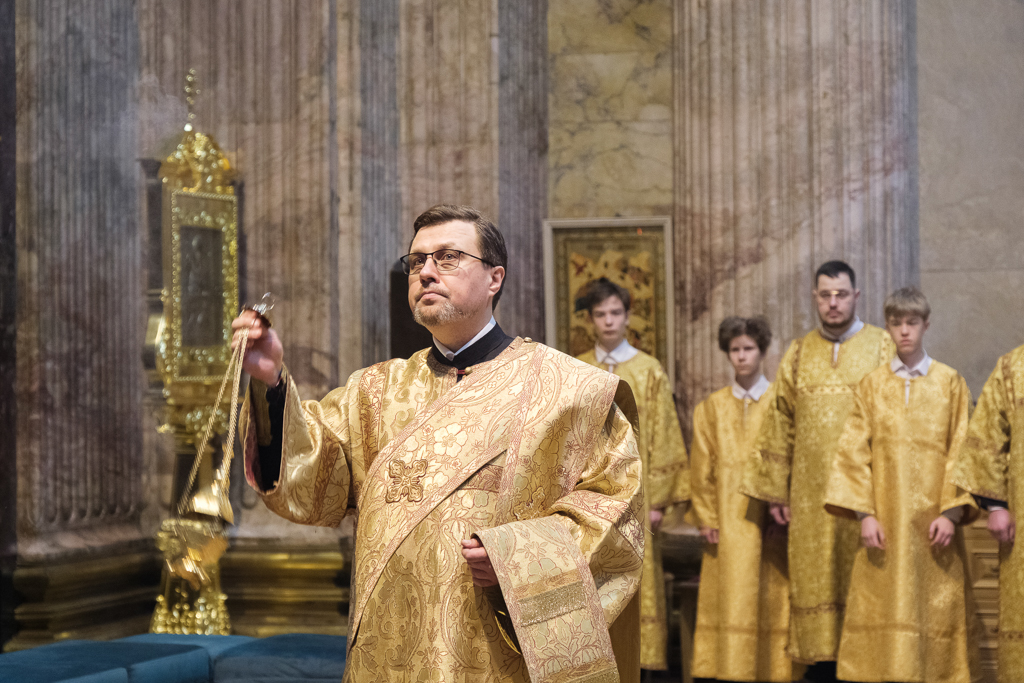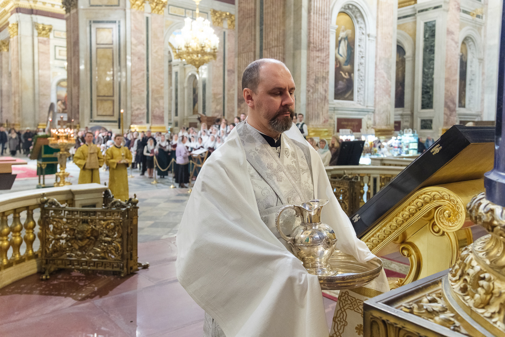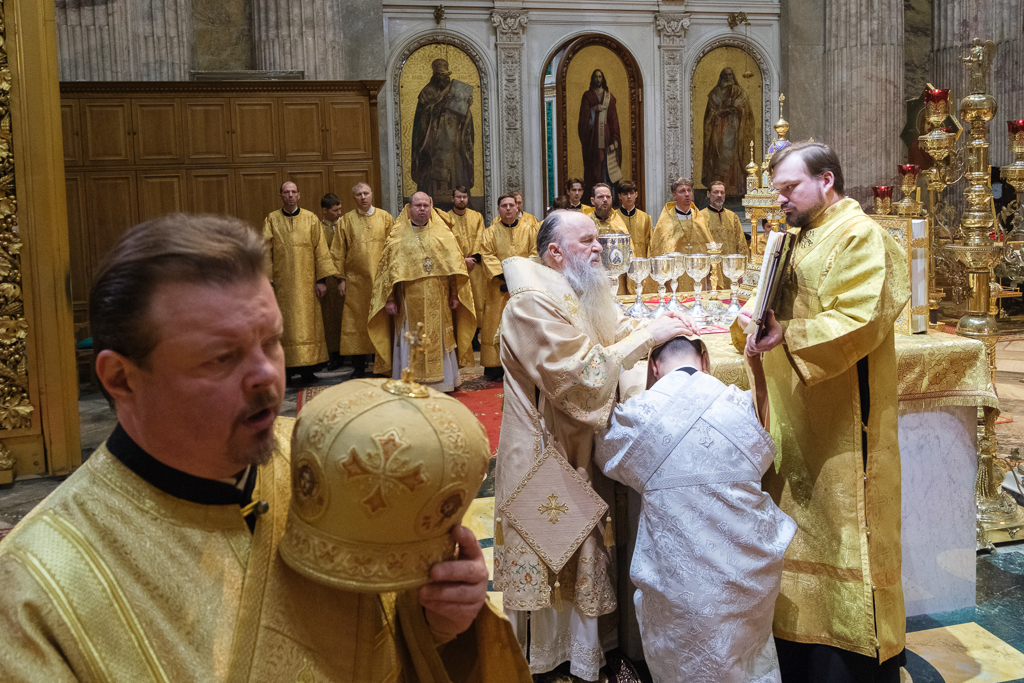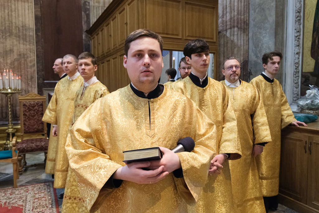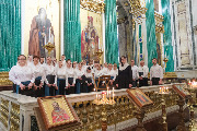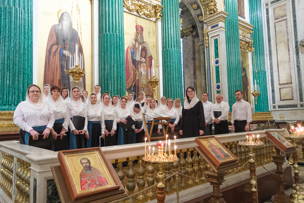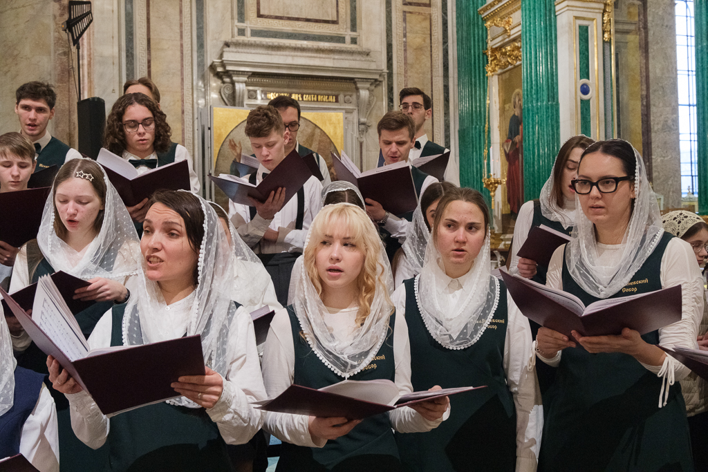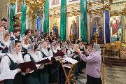 Пели хор собора под управлением Ольги Ширяевой, молодежный хор под управлением Ларисы Христич и любительский под управлением Анастасии Коздринь.Чтец храма святых Петра и Февронии Муромских в Петергофе Владимир Рябов был рукоположен во диакона.