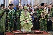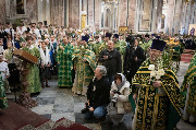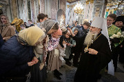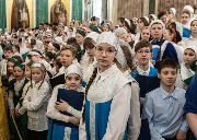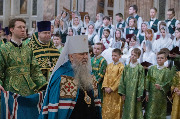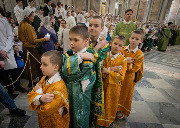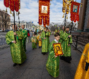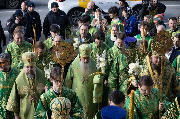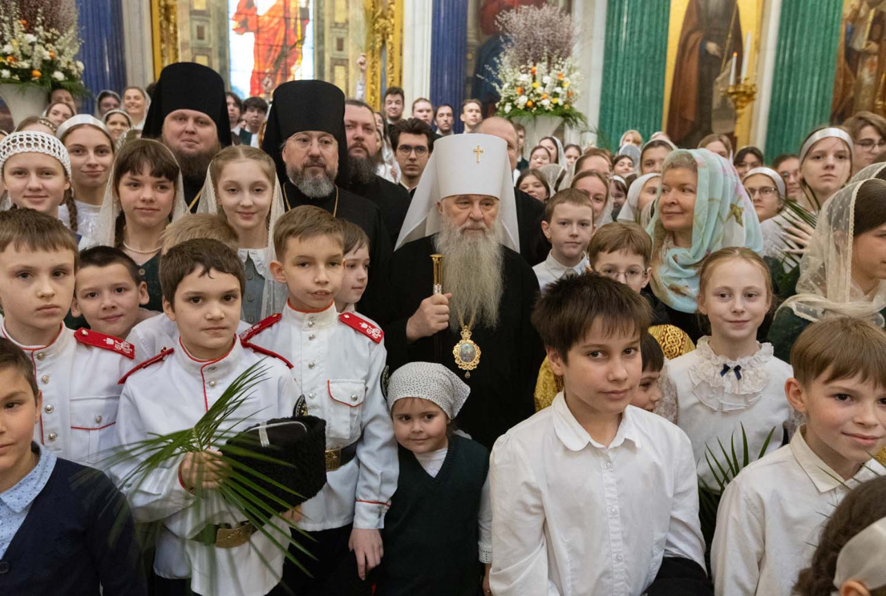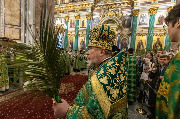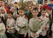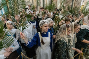 Был совершен крестный ход вокруг собора, в котором шествовали юные хоругвеносцы от благочиний епархии, воспитанники воскресных школ, детские хоры и все молящиеся. Участникам шествия раздали ветви вербы.
