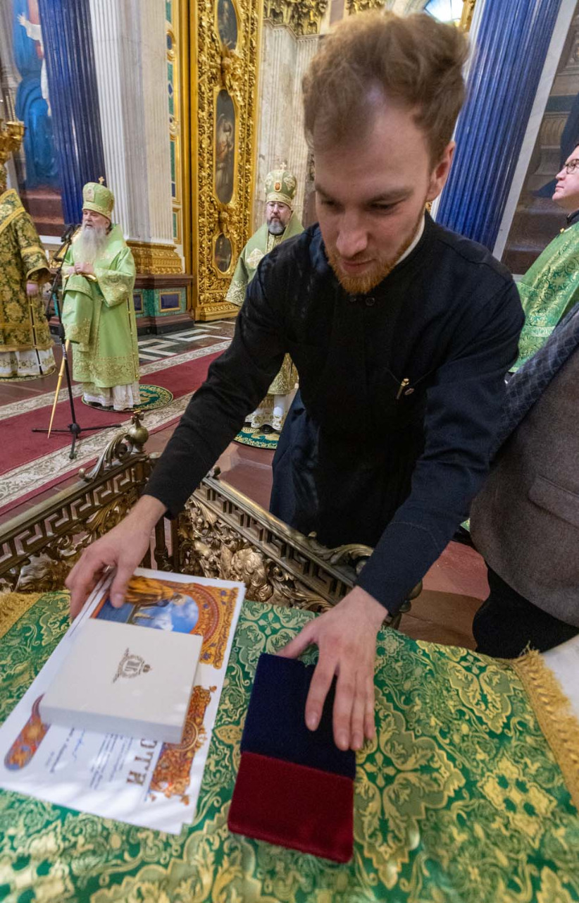За усердные труды на благо Святой Церкви были награждены: протодиакон Павел Шуклин (в связи с 20-летием служения в священном сане) - серебряной медалью апостола Петра, благотворитель и заслуженный художник России Михаил Кирильчук (в связи с 70-летием) - медалью апостола Петра, Валентина Климичева (в связи с юбилеем) - медалью апостола Петра. За заслуги перед Санкт-Петербургской митрополией ректор СПбГУТ Руслан Киричек был удостоен знака священномученика Вениамина, митрополита Петроградского.