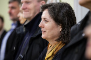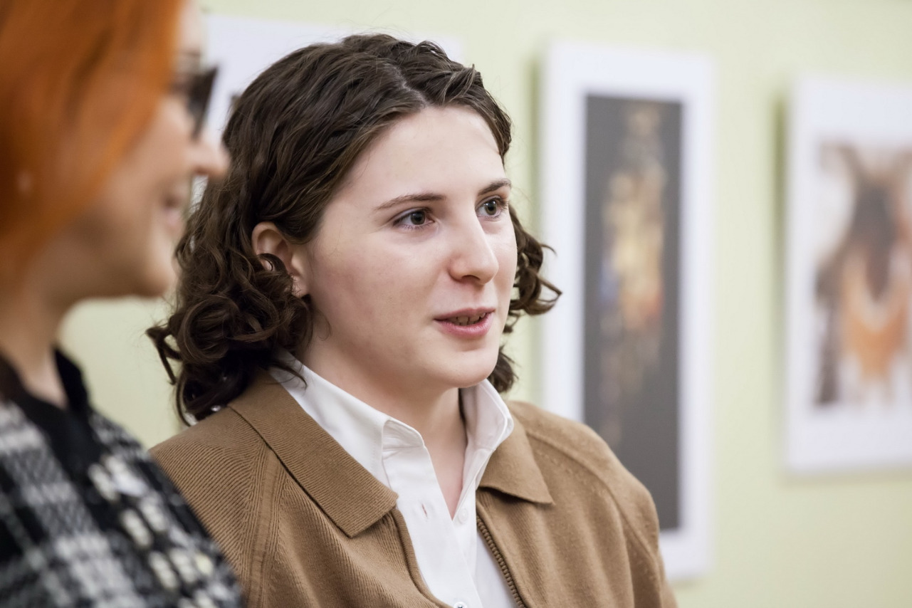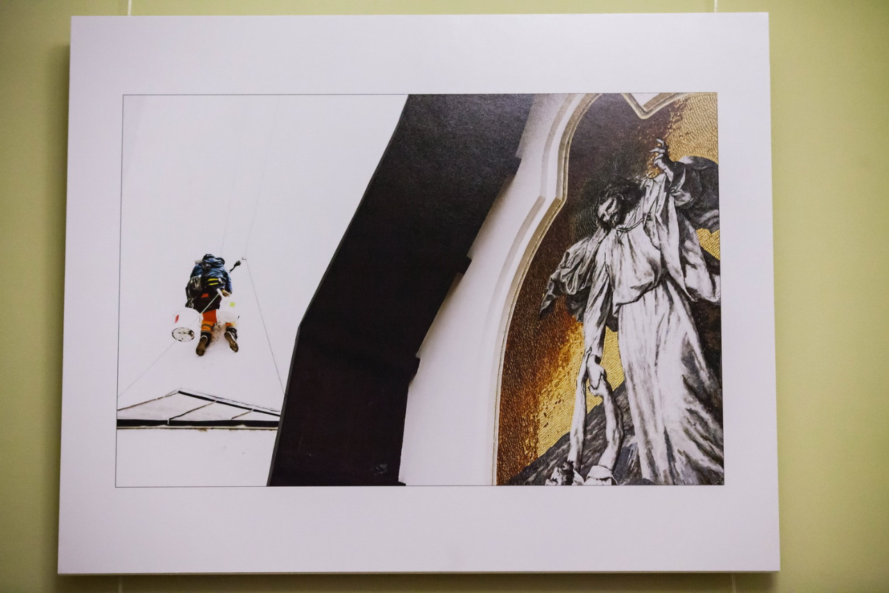 Она отметила одну из фотографий, которая произвела на нее сильное впечатление. На ней запечатлен промышленный альпинист на колокольне храма апостола Петра в Веселом поселке. Поскольку стены на фото практически не видно, то человек, висящий на тросах, по композиции двигается прямо в сторону неба. Рядом с ним - большая мозаика, на которой Иисус Христос спасает утопающего апостола Петра. По словам спикера, у этого кадра невероятный символический смысл. Человек, погруженный в пучину повседневных проблем, возможно какого-то отчаяния, неверия, может увидеть себя на месте спасенного апостола, получить надежду, увидеть путь к небу.