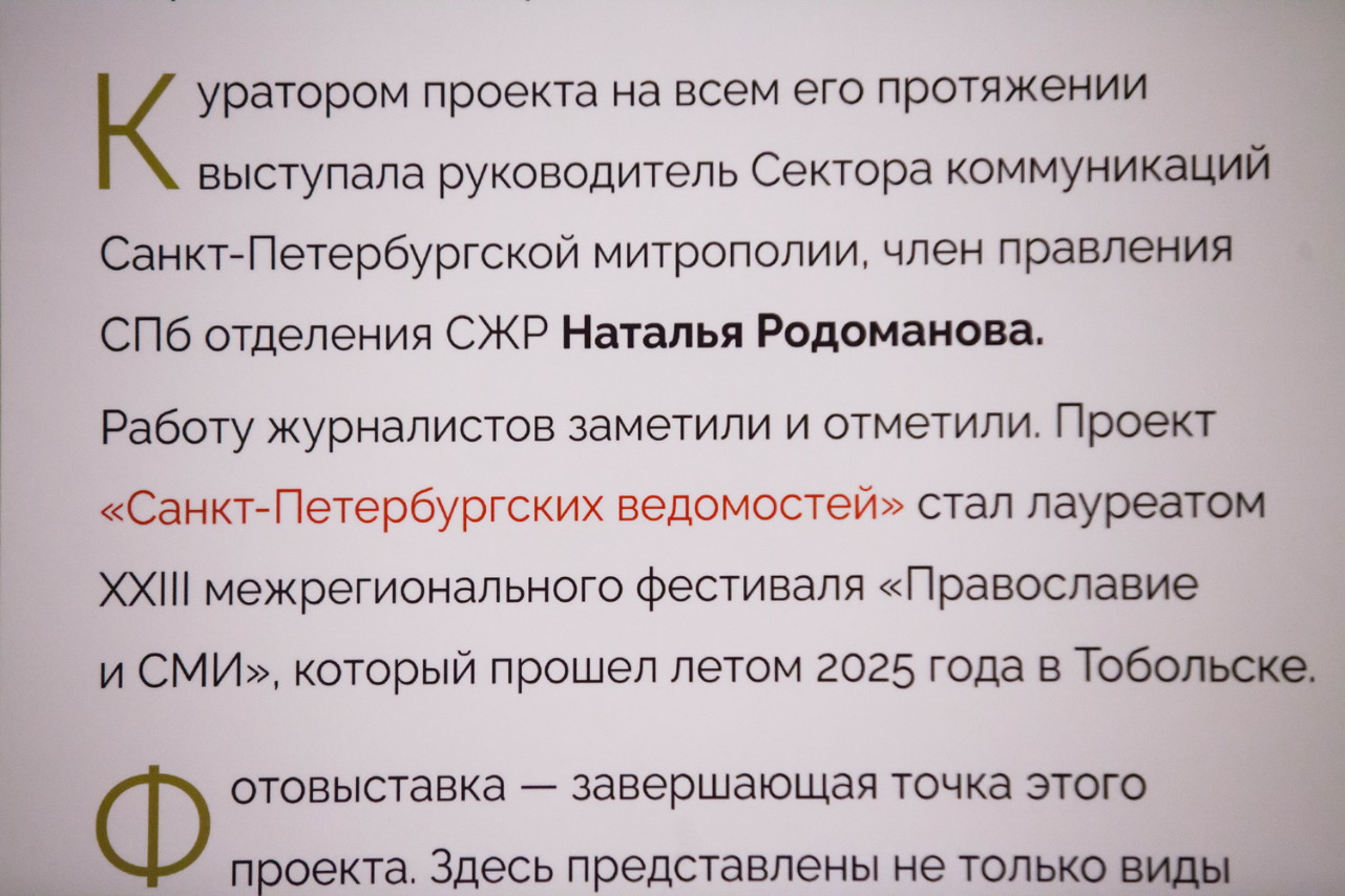 Фотовыставку "Доминанты: свет и звук" работает в выставочном зале на втором этаже Дома журналиста до 17 декабря. Адрес - Невский пр., 70. Вход свободный. Планируется, что экспозиция в 2026 году будет представлена в духовно-просветительских центрах храмов - участников проекта.