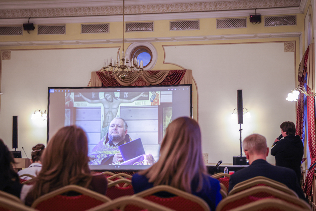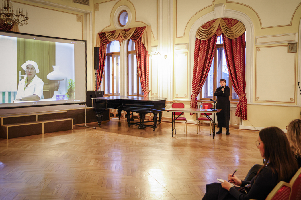 Были показаны фотографии сестры милосердия епархиальной больницы Ксении Блаженной. Сотрудницы учреждения поддерживают людей преклонного возраста. На одной из фотографий запечатлена сестра милосердия в момент отдыха: ее усталость читается во взгляде, в том, как опущены плечи, как рука ниспадает со стола. На следующем кадре та же медсестра, но здесь она совсем другая - бодрая, энергичная, спешащая на помощь. Два состояния одного человека, между ними - большое служение.