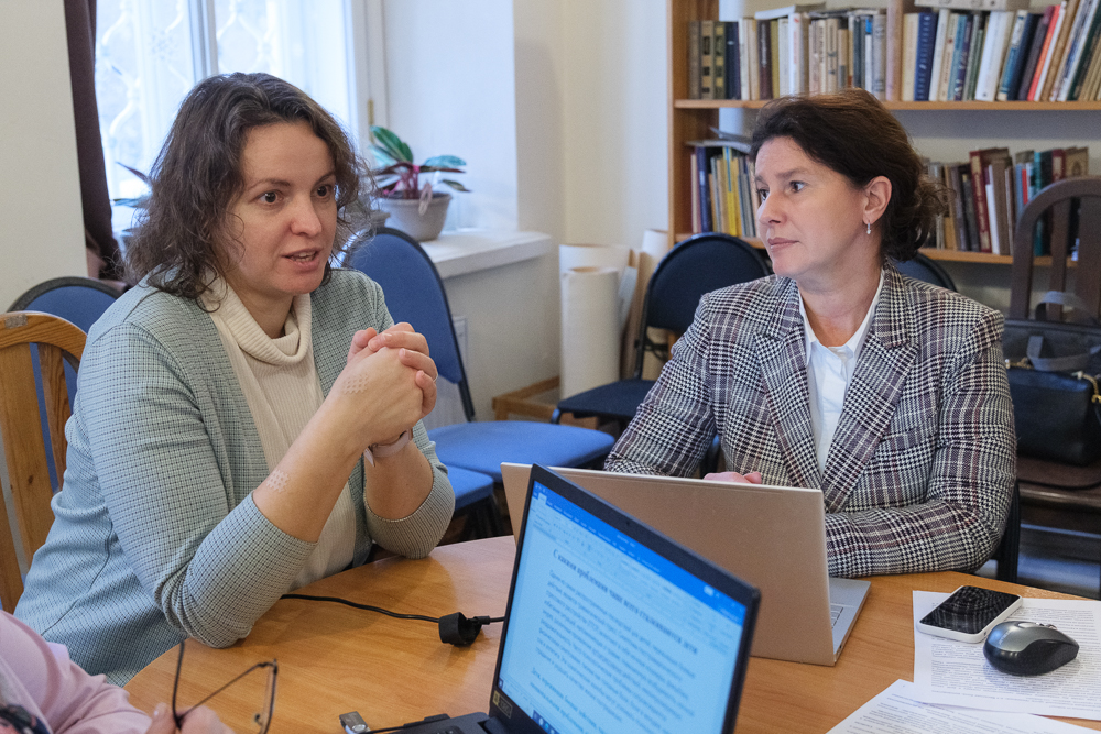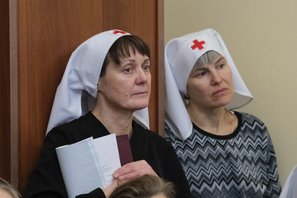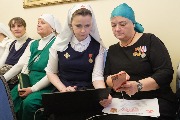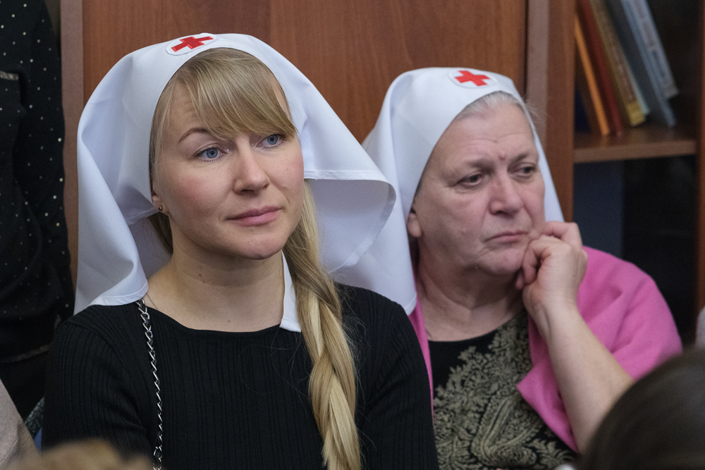 Старшая сестра сестричества Елена Кабакова рассказала о работе епархиального благотворительного фонда, который начал работать в марте 2022 года. С самого начала спецоперации люди стали активно помогать воинам и беженцам. Гуманитарную помощь также оказывает Ленинградский военный округ. При сестричестве организованы три мастерские, где плетут маскировочные сети, работают епархиальные курсы сестер милосердия.