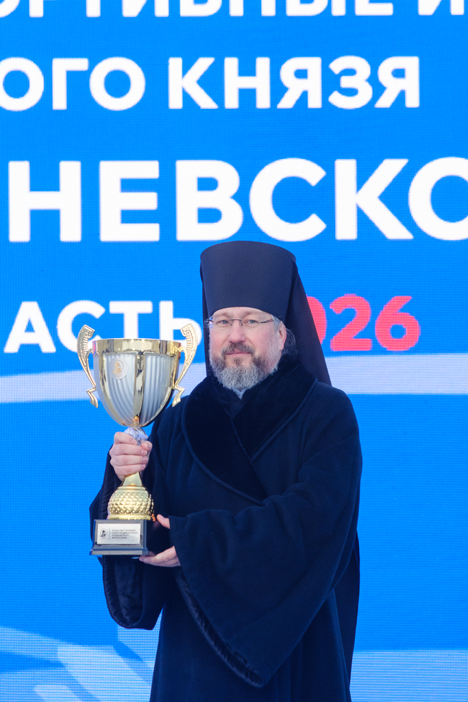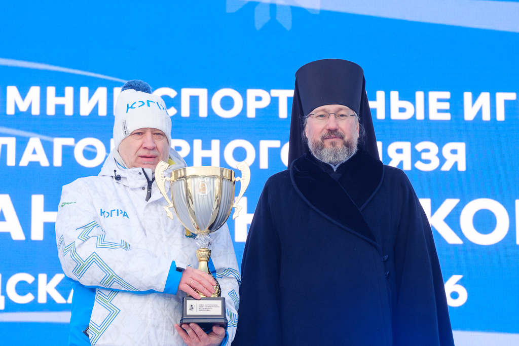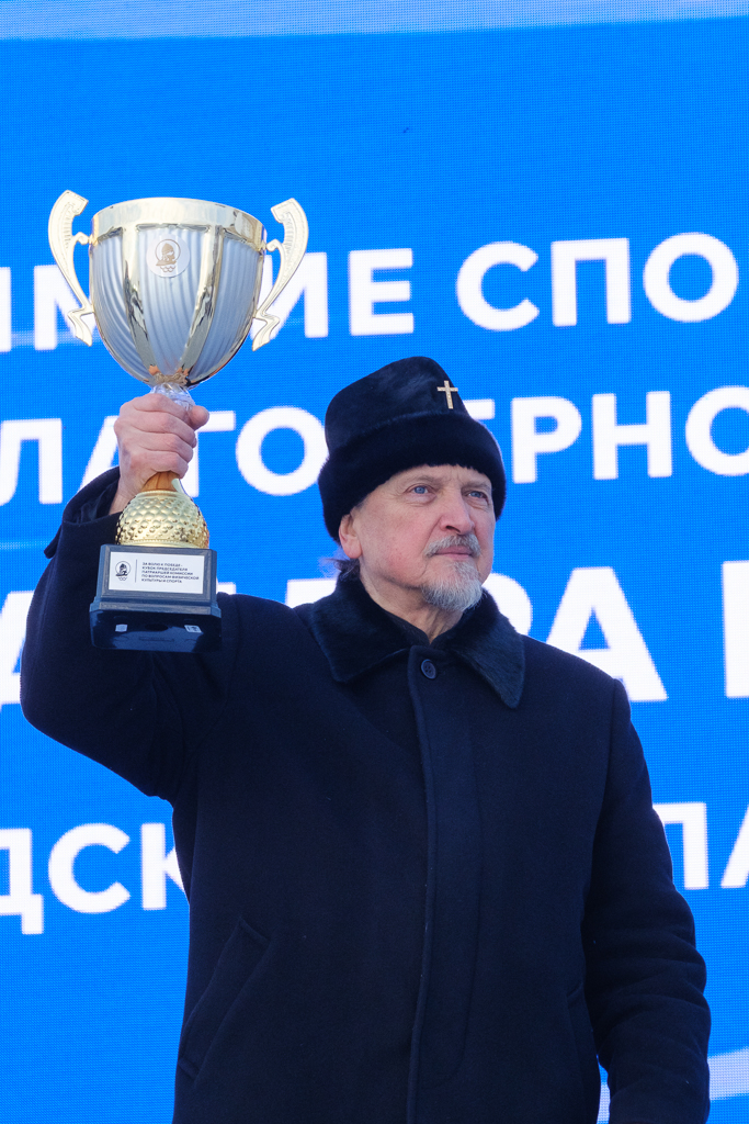 Кубок митрополита Санкт-Петербургского и Ладожского Варсонофия епископ Кронштадтский Вениамин вручил победителю в общекомандном зачете по выполнению норм комплекса ГТО - команде Ханты-Мансийского автономного округа "Югра".