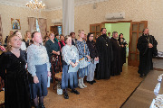Предваряя доклад учителя русского языка и литературы школы № 53 Марии Лукосяк "Церковные ценности. Изъятие и их дальнейшая судьба", отец Александр отметил, что Церковь добровольно отдавала ценности в фонд помощи голодающим, и в храме есть вещественные подтверждения этого факта: на некоторых старинных иконах заметны следы гвоздиков от снятых окладов.