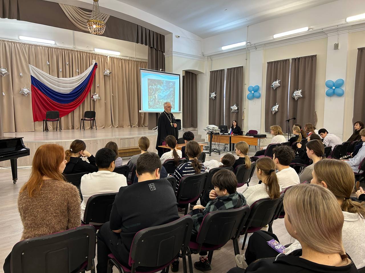Руководитель катехизаторских курсов Казанского кафедрального собора иерей Георгий Кобрин 5 декабря провел встречу с учащимися 6-7 классов школы № 153 Центрального района имени героя РФ Владимира Таташвили в рамках соглашения между школой и духовно-просветительским центом "Керигма".